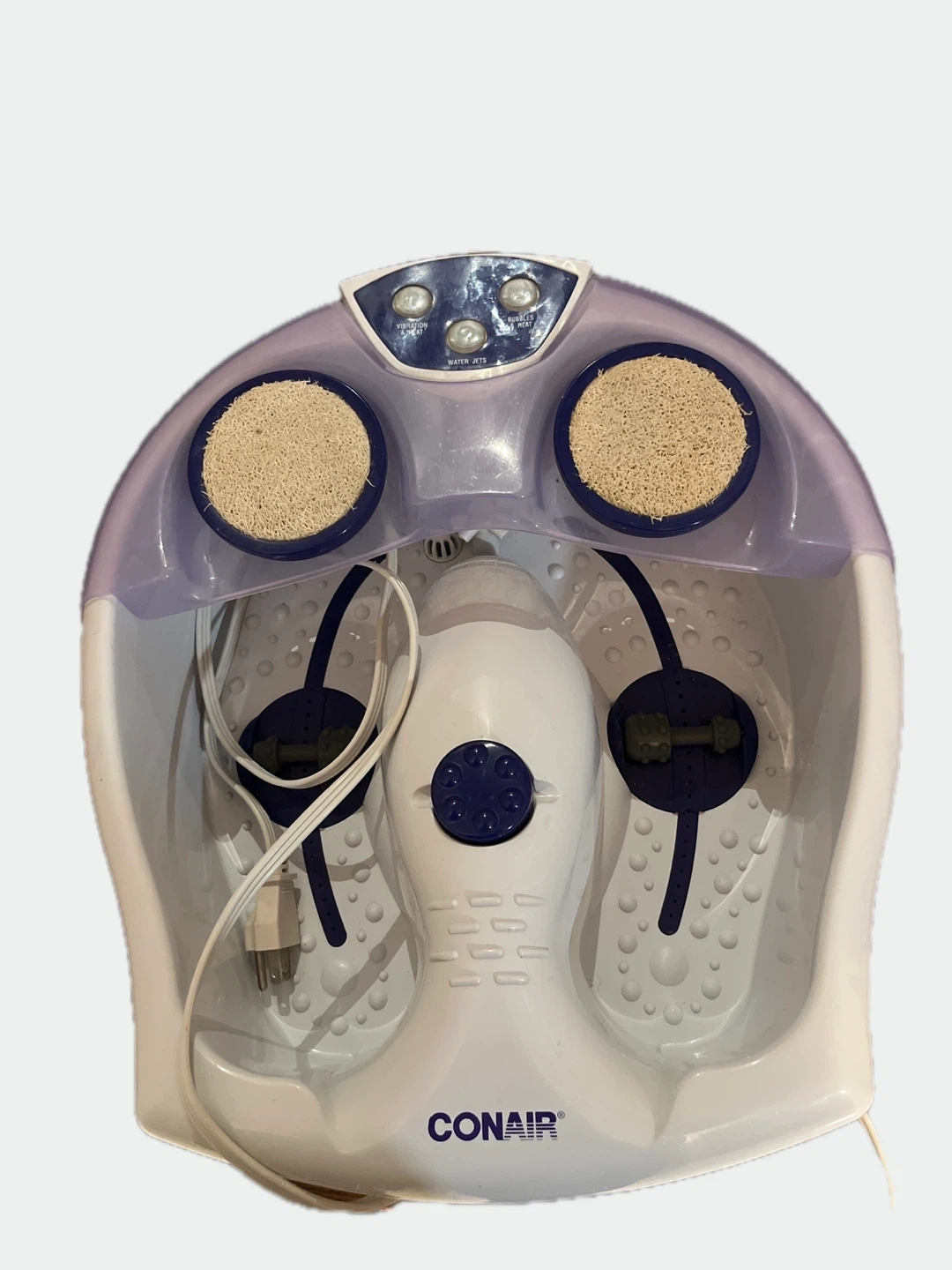 This Used Conair foot spa features water jets and heat for a relaxing soak. It has built-in pumice stones and a soothing massage roller. Perfect for unwinding after a long day!