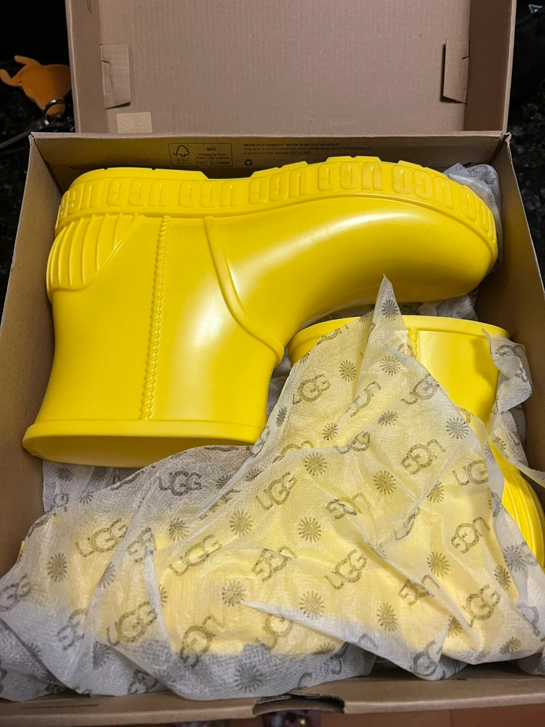These bright yellow UGG rain boots are perfect for puddle jumping! They're made with waterproof material and have a cozy lining inside. Comes with the original box.