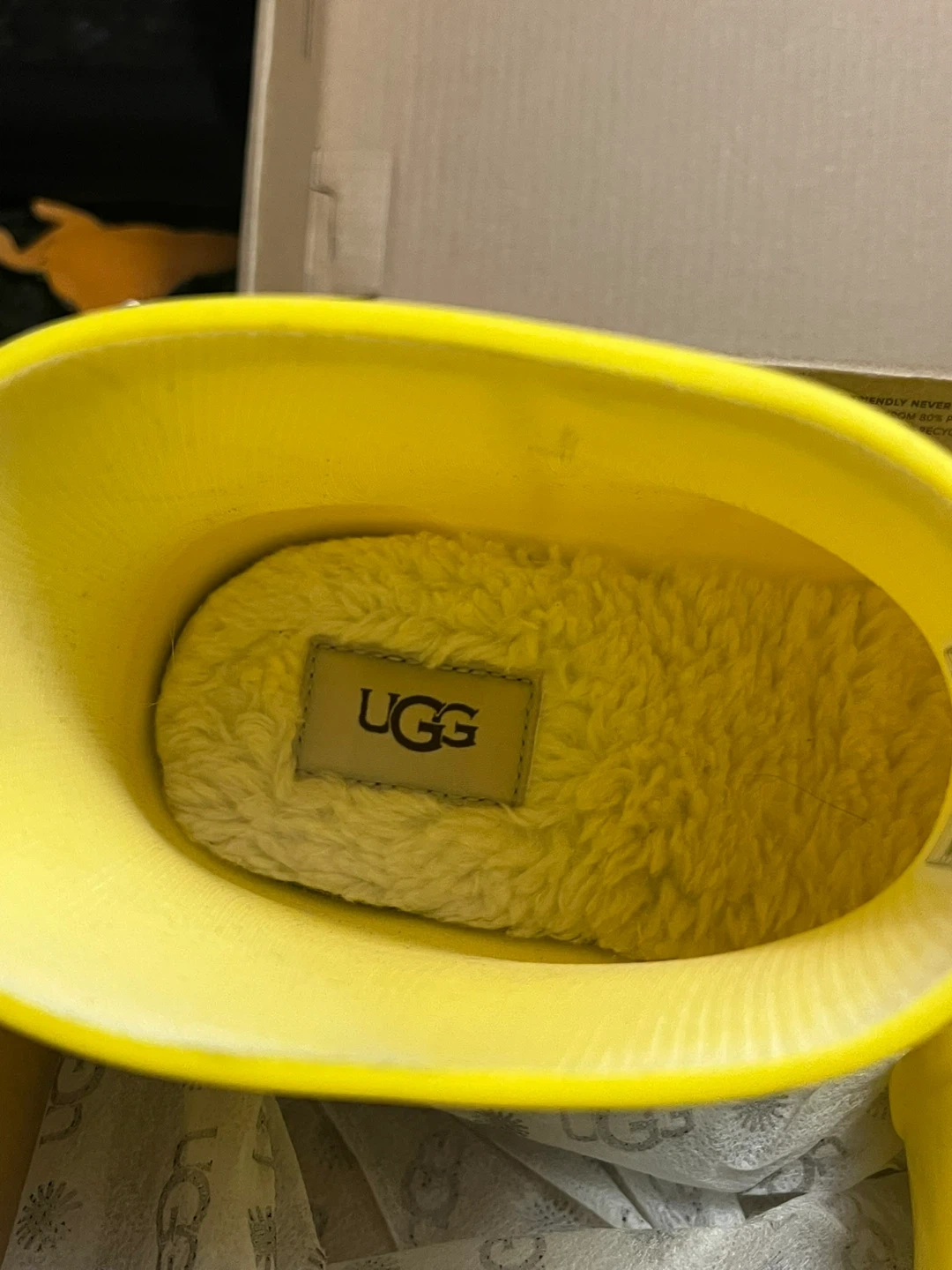 These bright yellow UGG rain boots are perfect for puddle jumping! They're made with waterproof material and have a cozy lining inside. Comes with the original box.