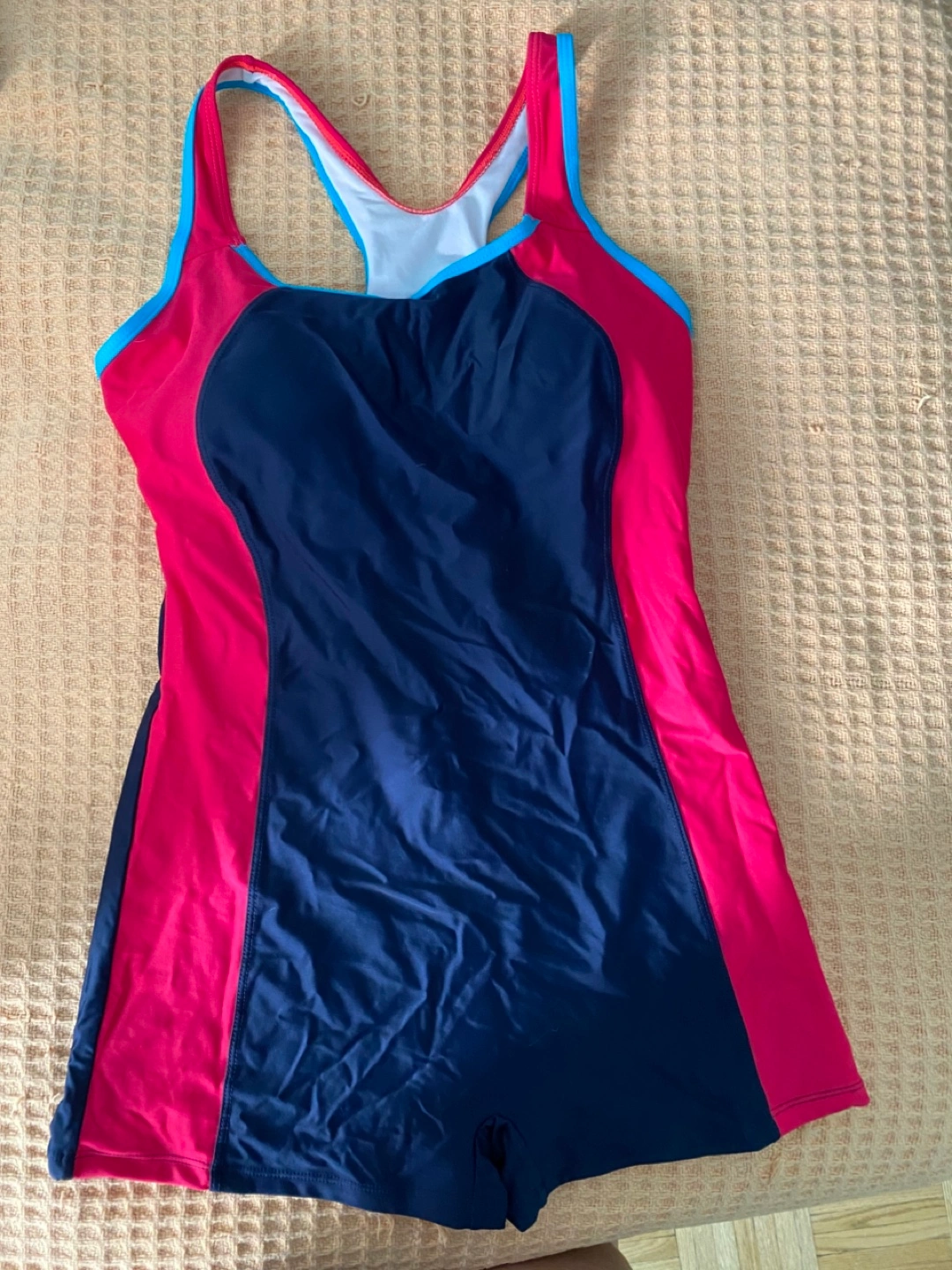 Swimsuit in great condition! It's a size 44 and features a stylish design with blue, pink, and red colours. The material is 82% nylon and 18% elastane, making it comfortable and stretchy for swimming or lounging by the pool