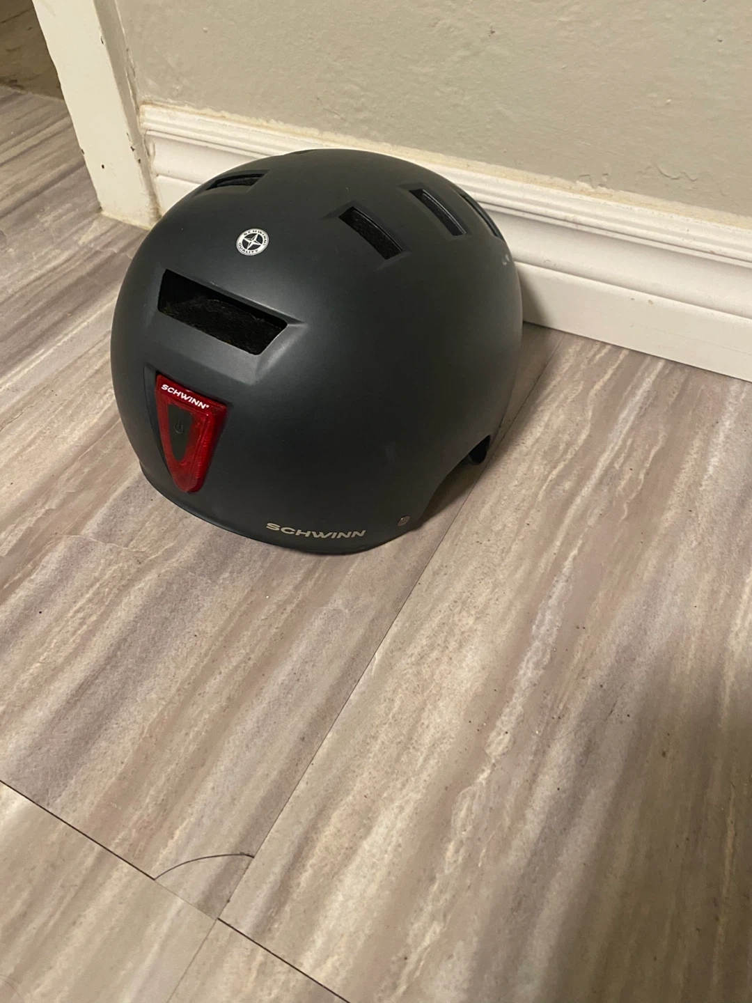 This is a black Schwinn bicycle helmet. It has a built-in rear red LED light for added visibility. Multiple vents keep things cool while you ride.