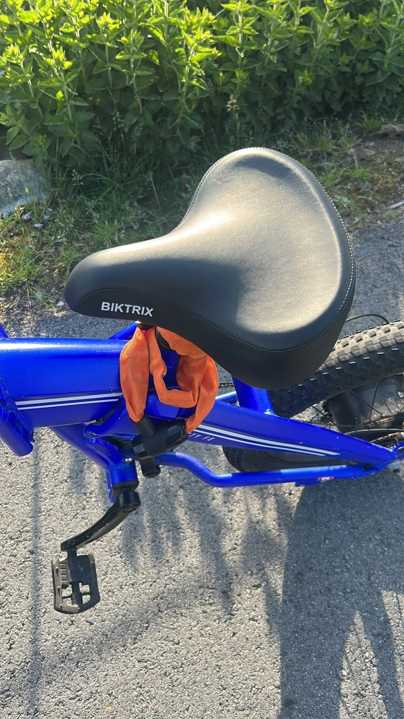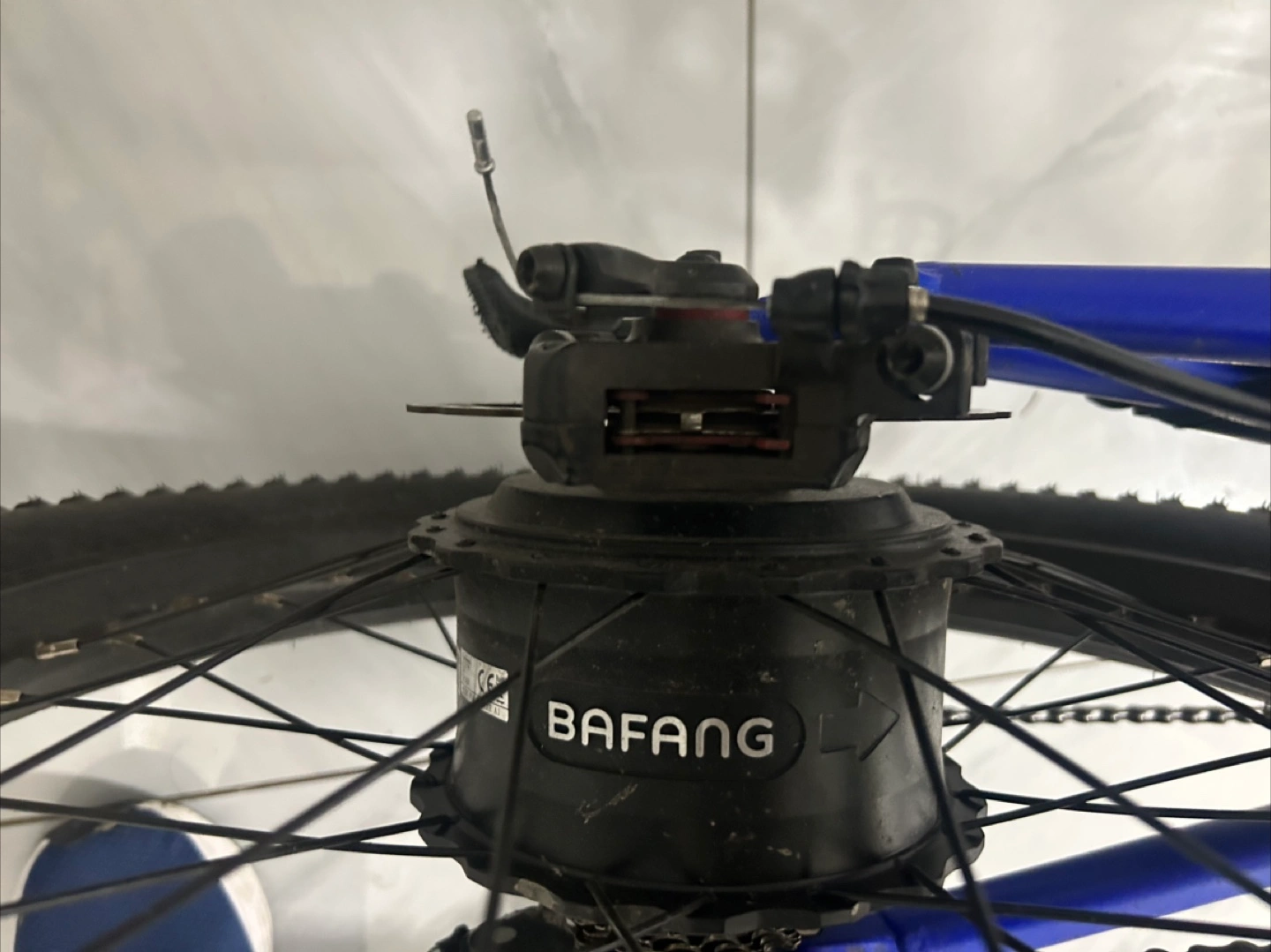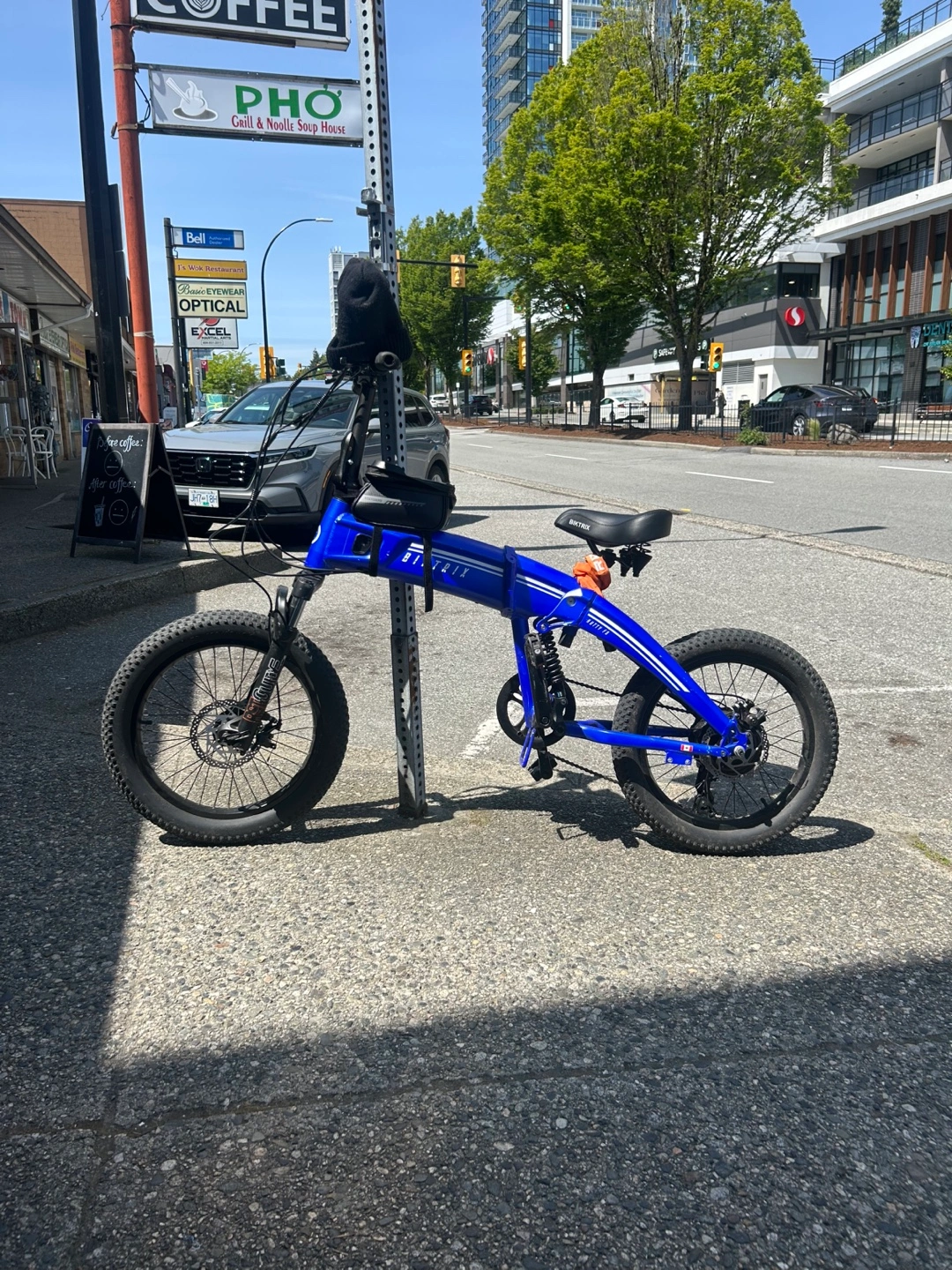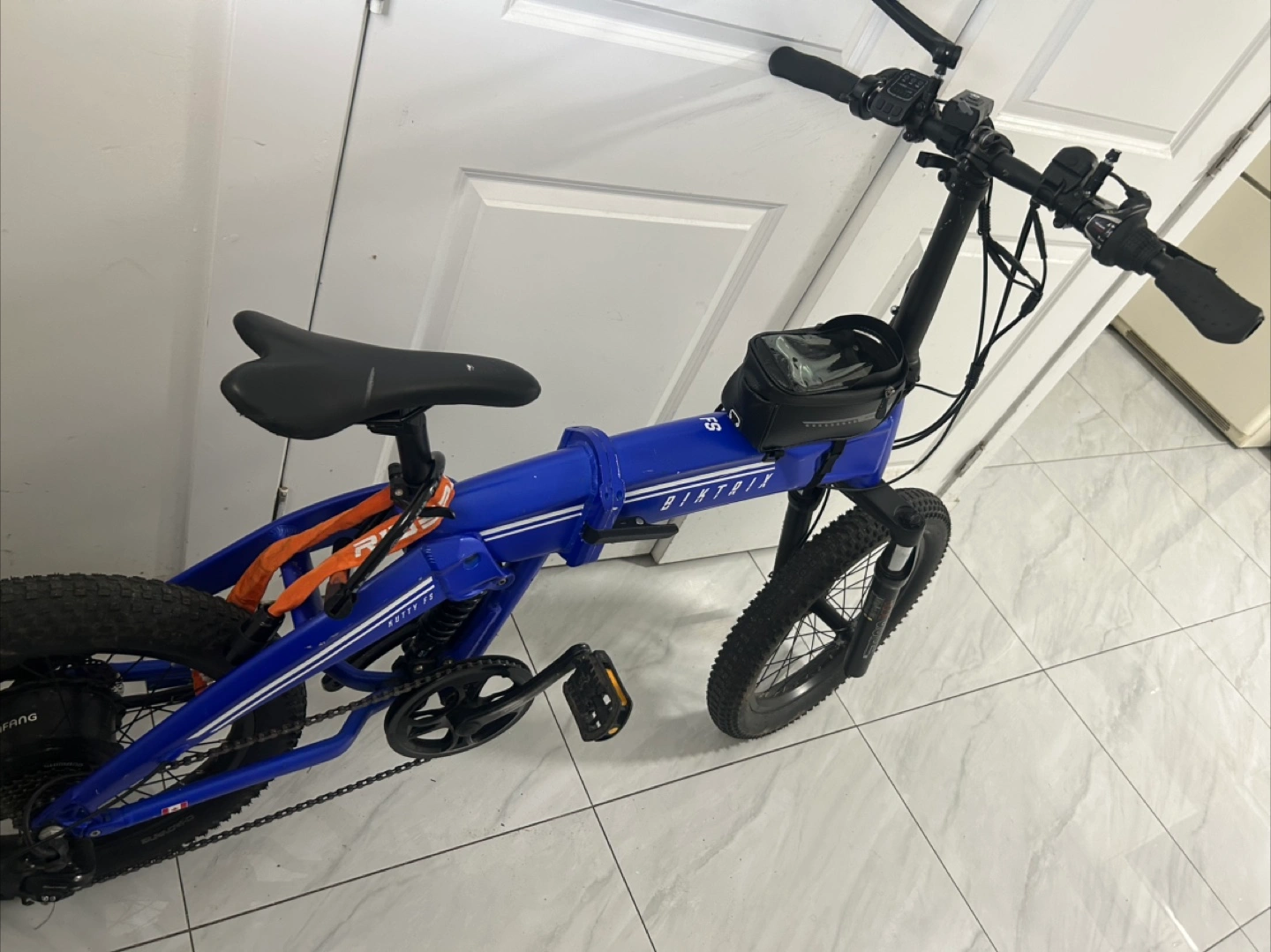 A beautiful Biktirx Futty FS blue folding e-bike. Battery is dead, needs to be replaced. It features a comfortable seat and thick tires. Equipped with a motor and hand brakes. This bike Needs a battery.