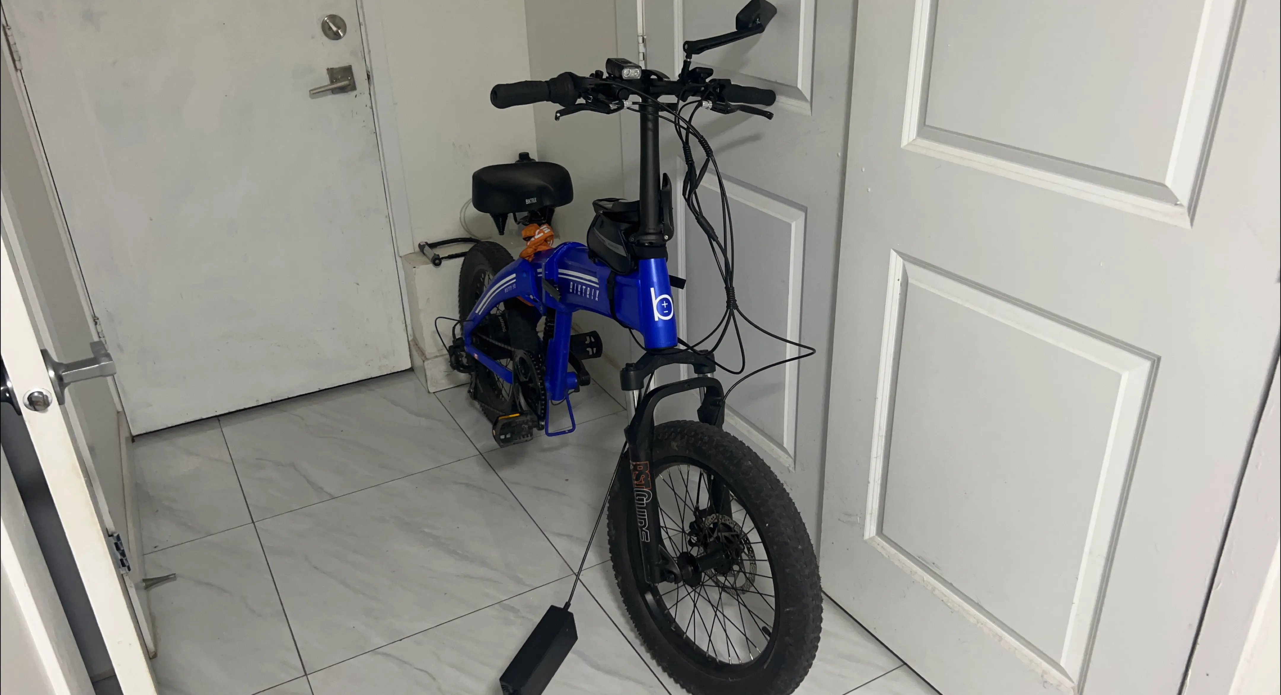 A beautiful Biktirx Futty FS blue folding e-bike. Battery is dead, needs to be replaced. It features a comfortable seat and thick tires. Equipped with a motor and hand brakes. This bike Needs a battery.