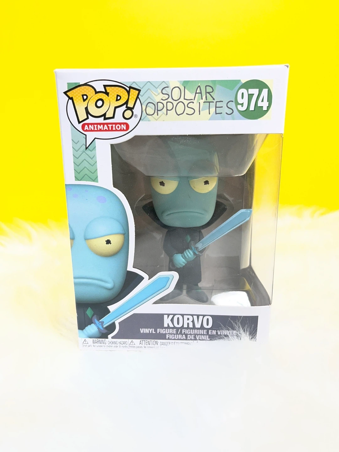 Spice up your collection with this Funko Pop! Animation Solar Opposites - Korvo #974 vinyl figure, complete with a cool sword. The item is in good condition, ready to be displayed. The box has some minor shelf wear and Korvo has a scratch on his face so the price has been adjusted for that reason .