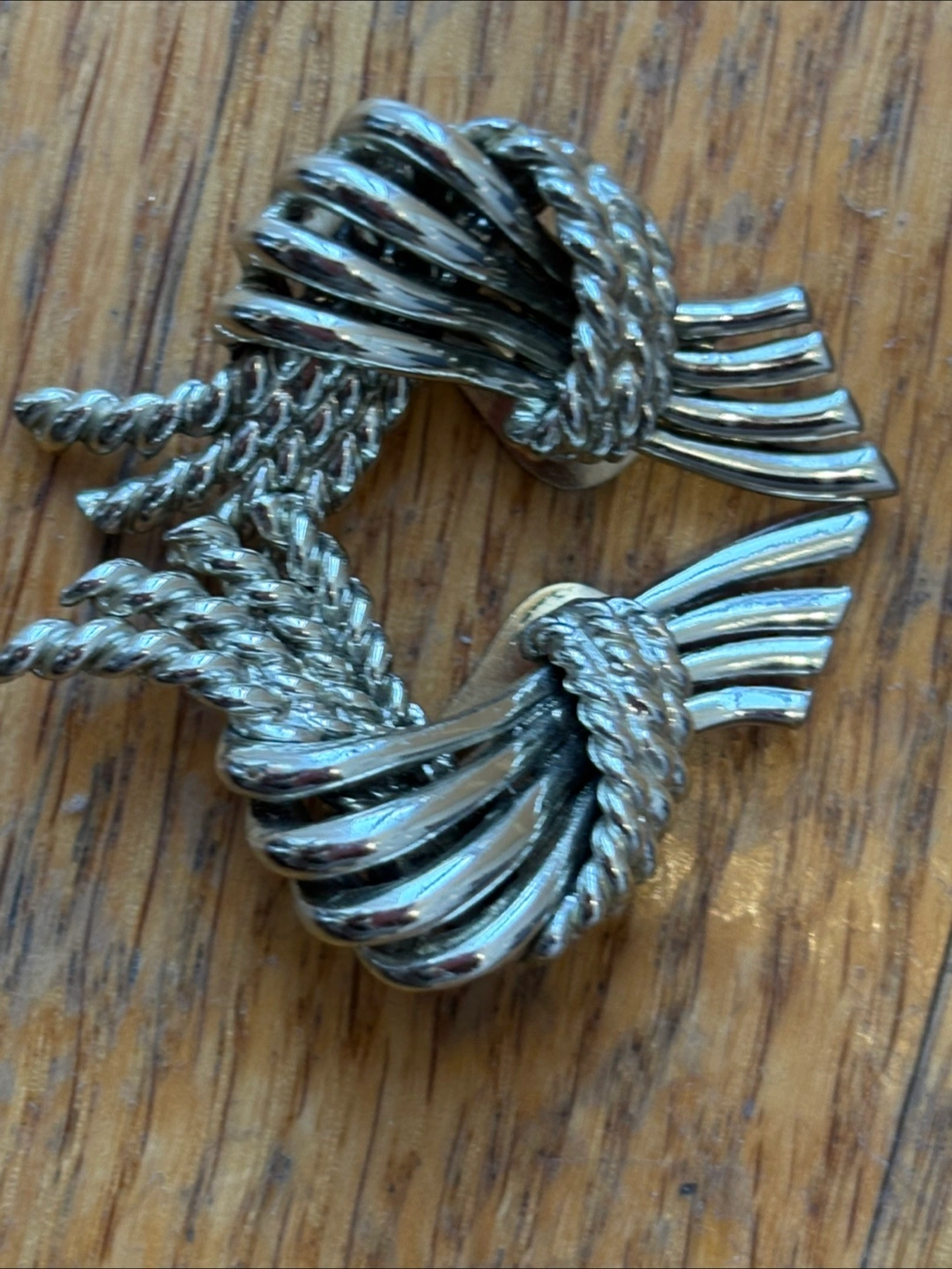 Unique silver-tone clip-on earrings. Rope and ribbed design. Excellent vintage condition.