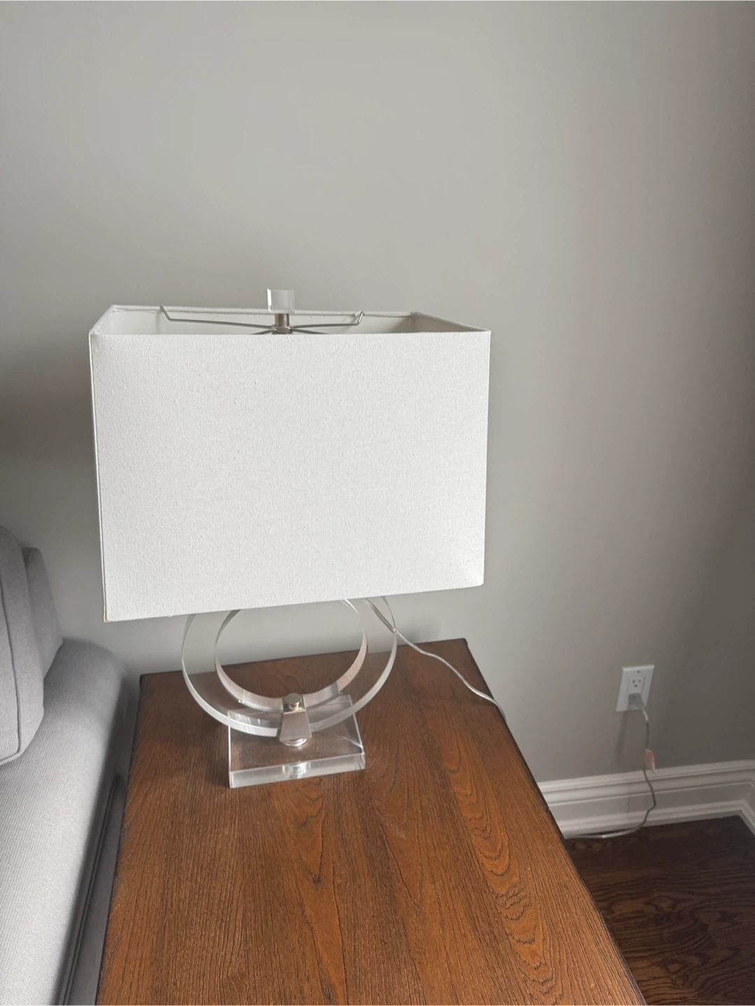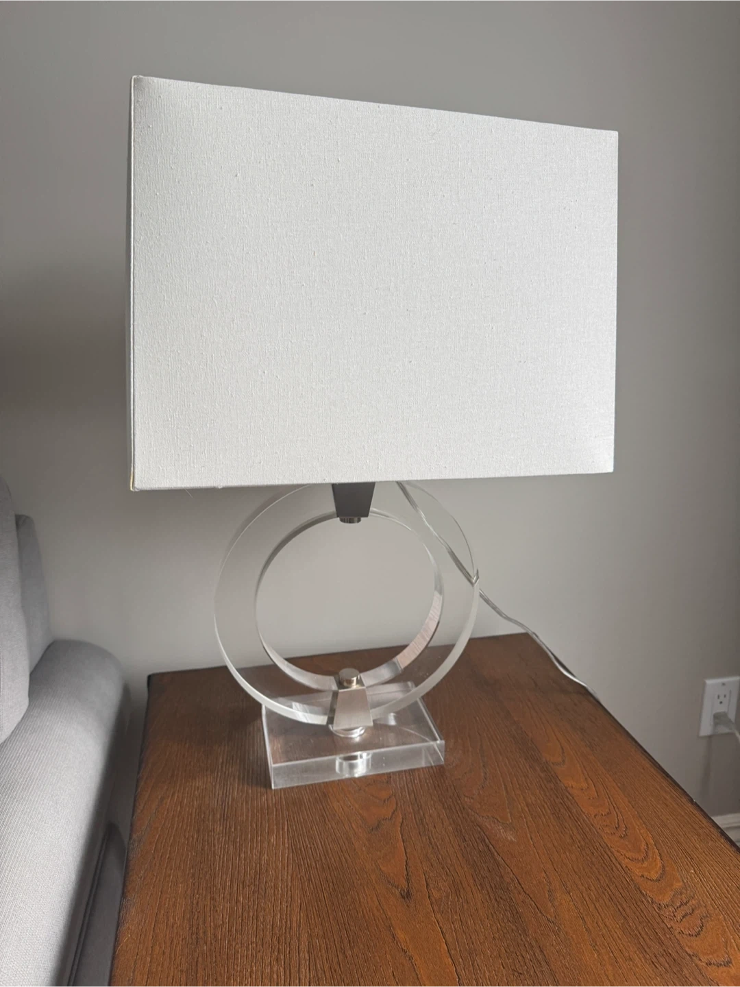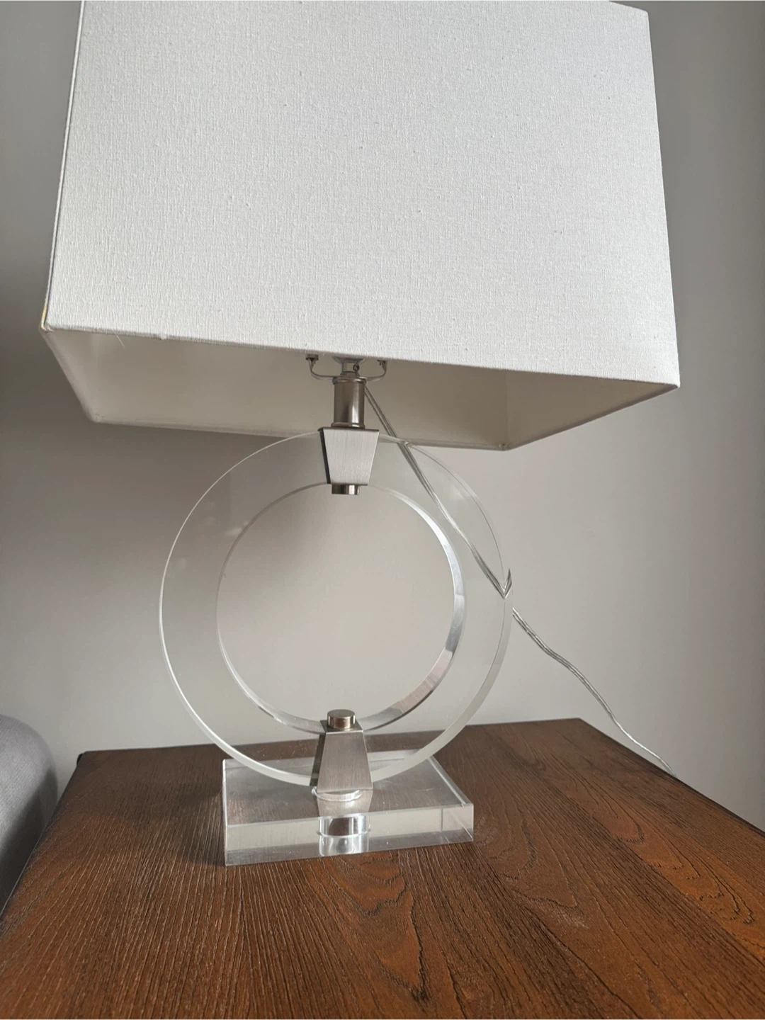 Selling a lovely circle accent table lamp. It has a white rectangular shade and a clear acrylic base with a circular design. It would look great in any living room or bedroom!