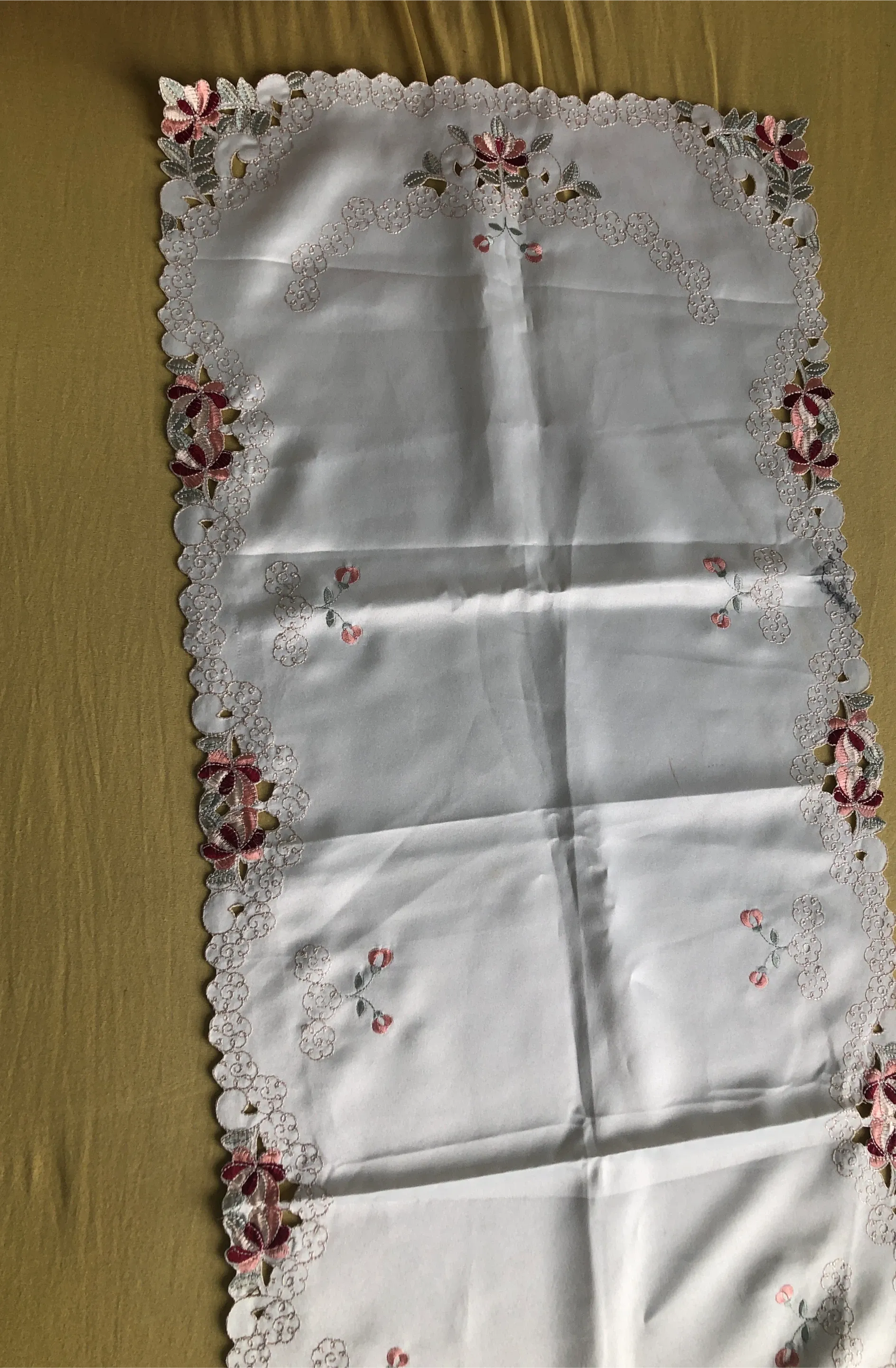 This elegant off white table runner features delicate floral embroidery along the edges. It's made of a smooth, satin-like material. This runner would add a lovely decorative touch to any dining table or buffet display.
