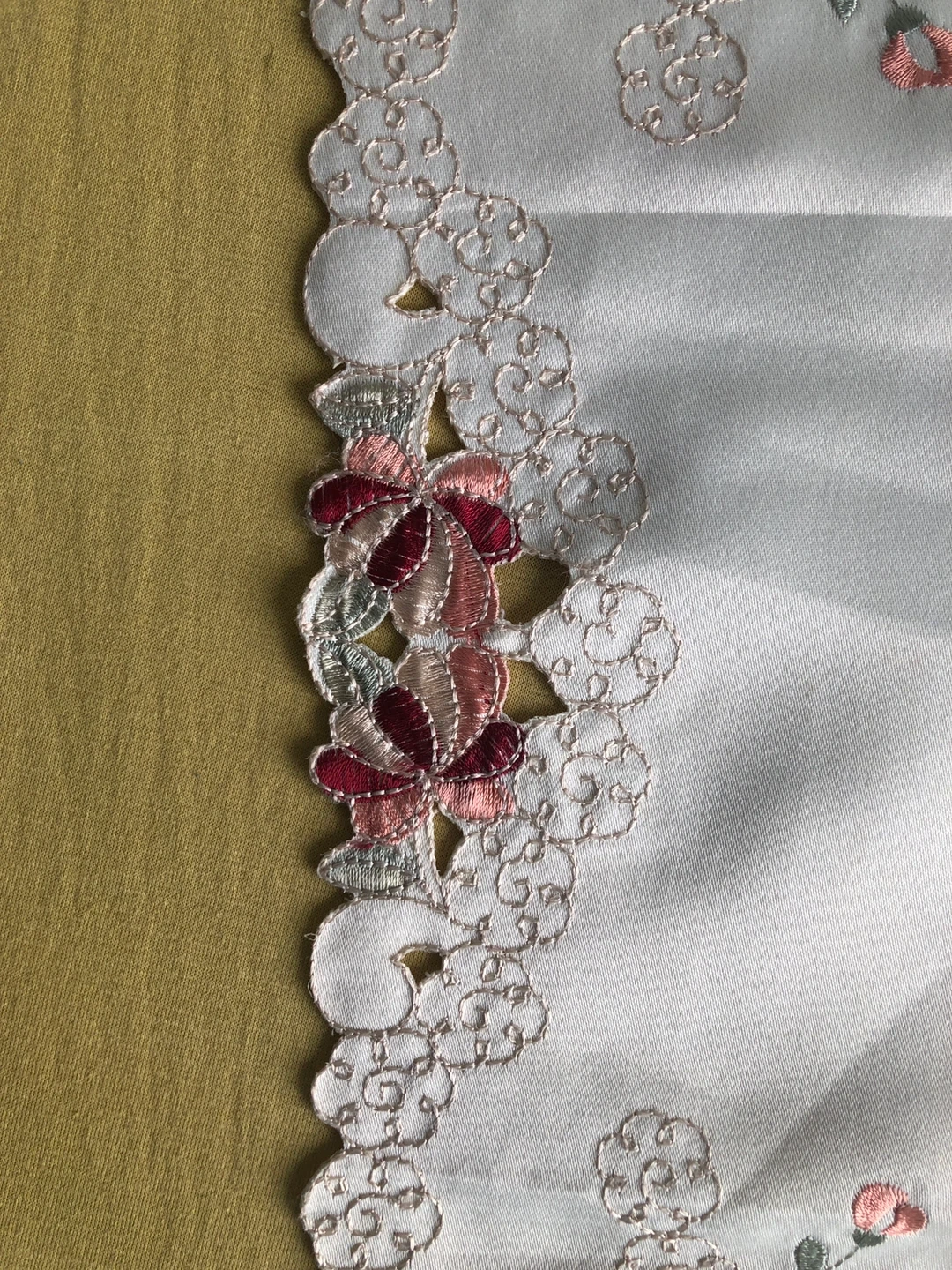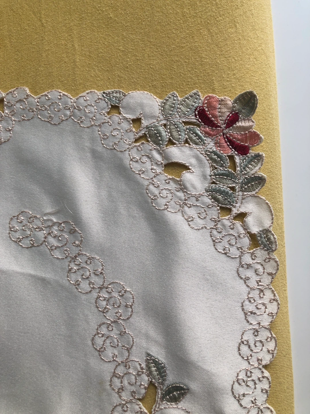 This elegant off white table runner features delicate floral embroidery along the edges. It's made of a smooth, satin-like material. This runner would add a lovely decorative touch to any dining table or buffet display.