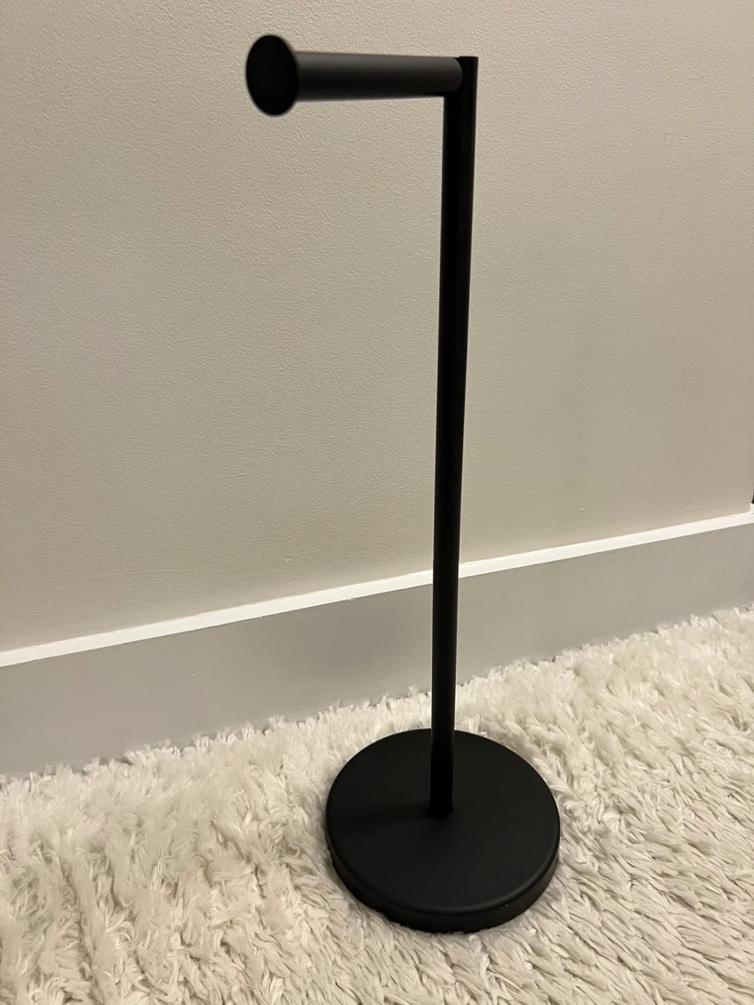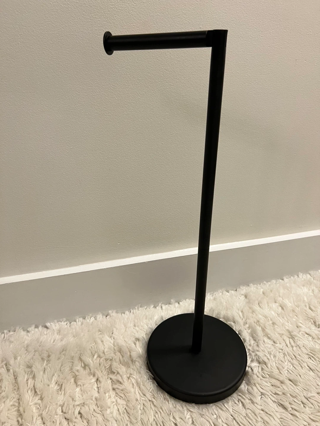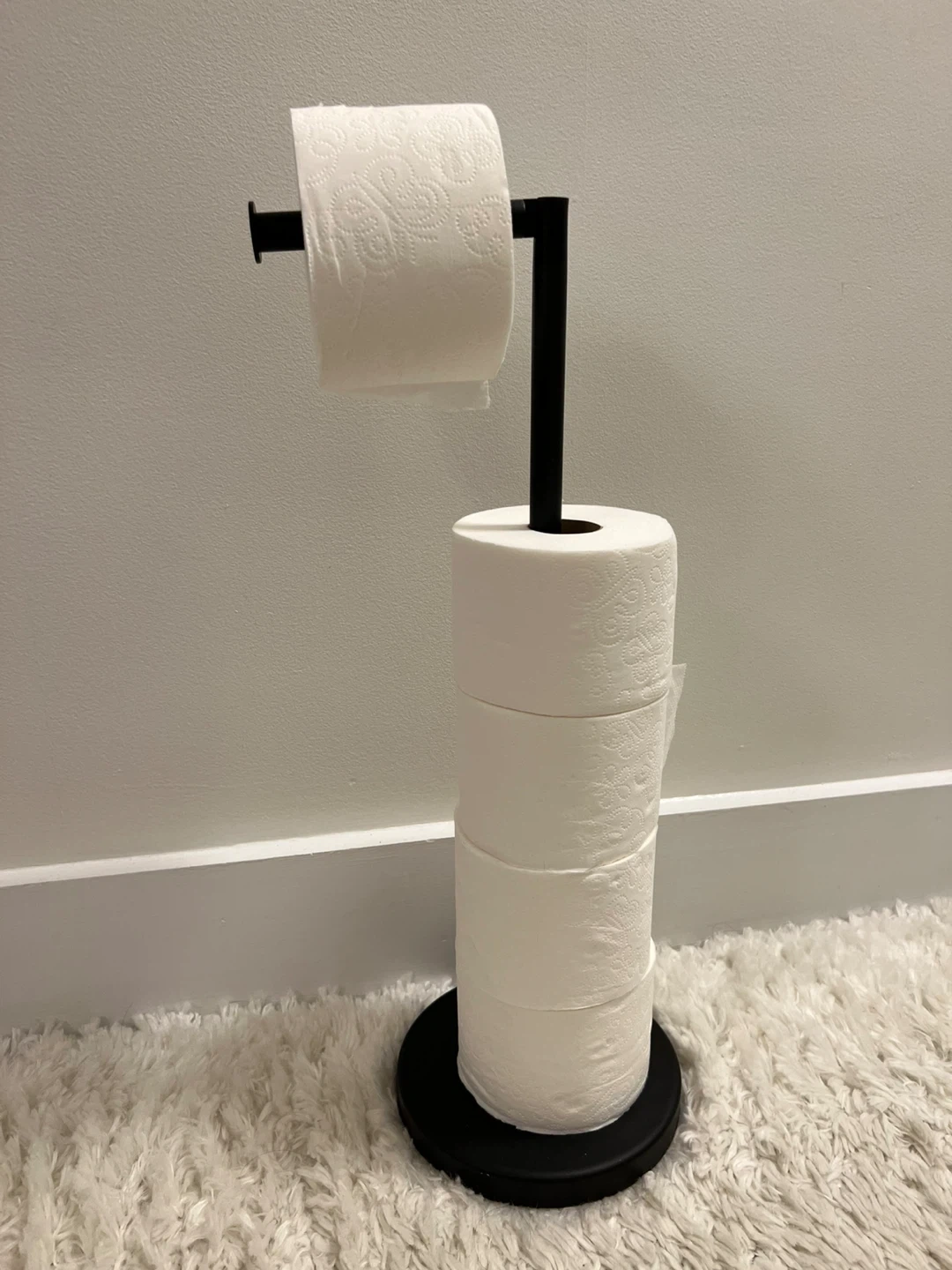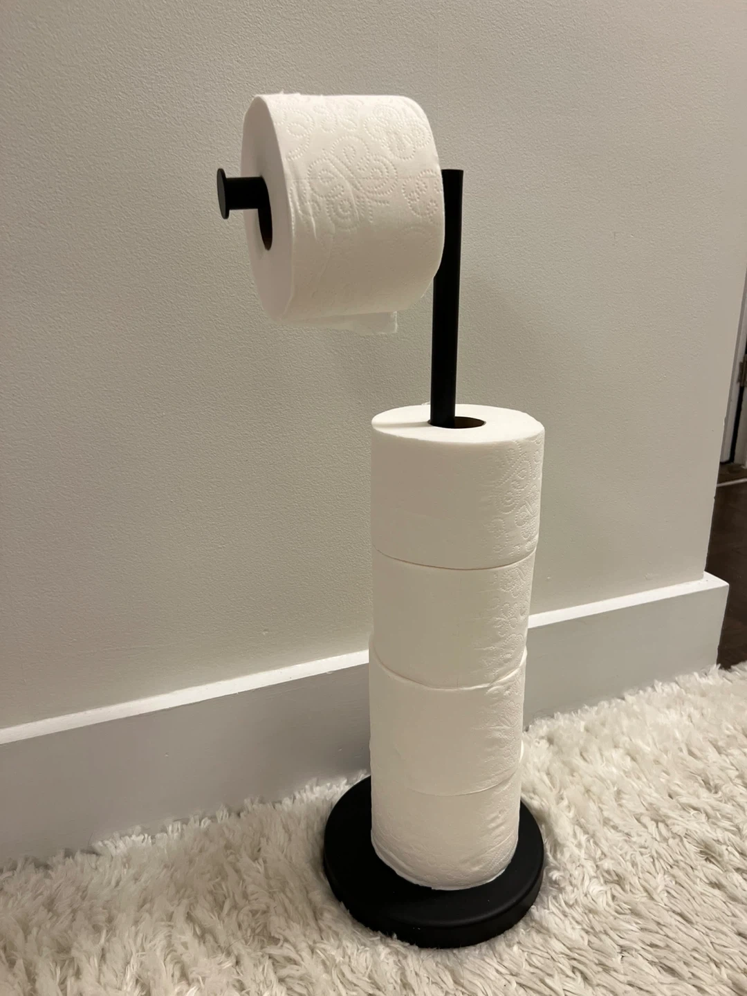 Toilet paper holder stand in black. It is in great condition and ready for a new home! It holds the roll in use at the top and extra rolls below- great storage! *Toilet paper not included :)