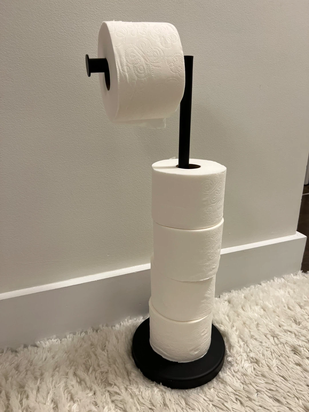 Toilet paper holder stand in black. It is in great condition and ready for a new home! It holds the roll in use at the top and extra rolls below- great storage! *Toilet paper not included :)