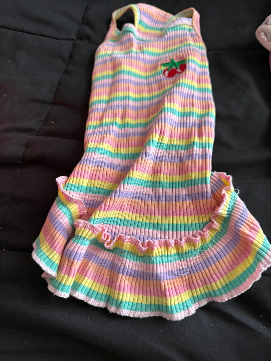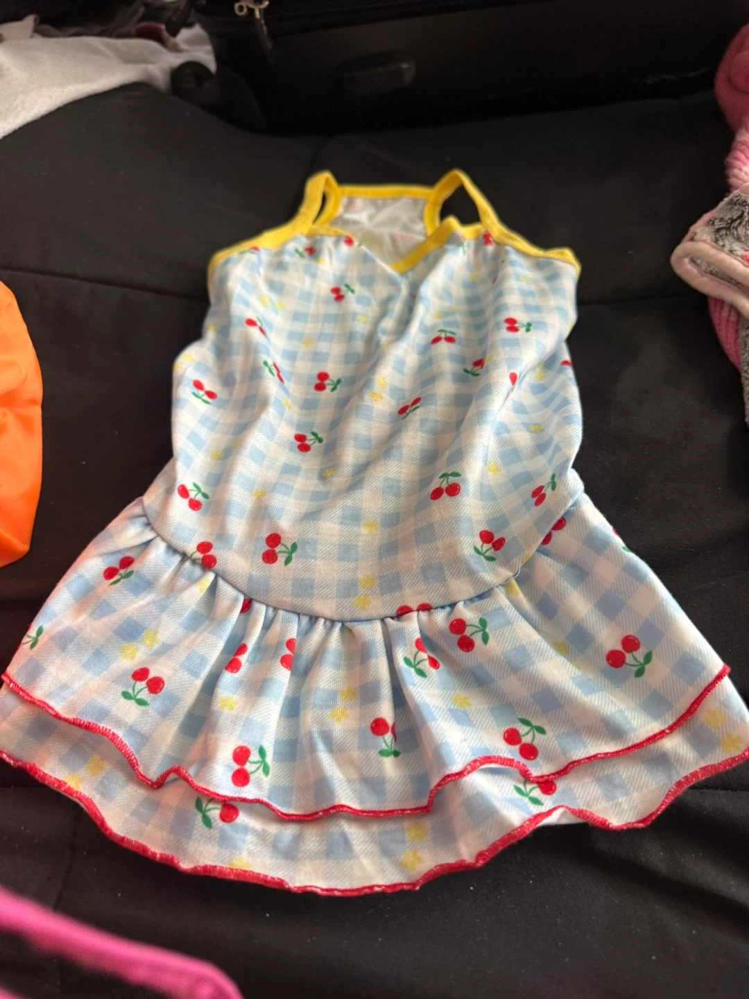 Three adorable pet dresses with fun fruit and cherry patterns. Includes a white dress with lemons and oranges, a blue checkered dress with cherries, and a colourful striped dress with a cherry detail. They're super cute for your furry friend! Size M. 3/$20. Not willing to Split
