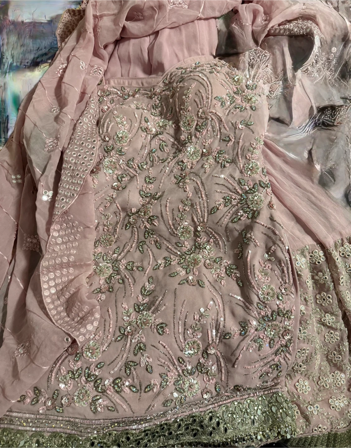 This is a beautiful pink formal dress with intricate embroidery and mirror work all over. It includes a matching dupatta. Perfect for special occasions!