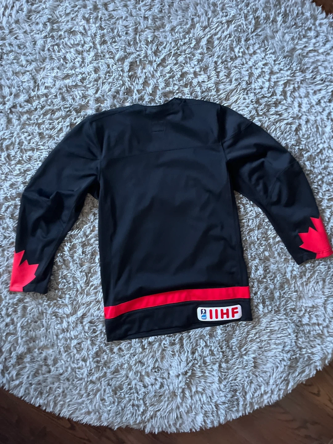 Black hockey jersey featuring "CANADA" in red with a large red maple leaf. It has red maple leaf accents on the shoulders and sleeves. This jersey has a ribbed collar and cuffs.