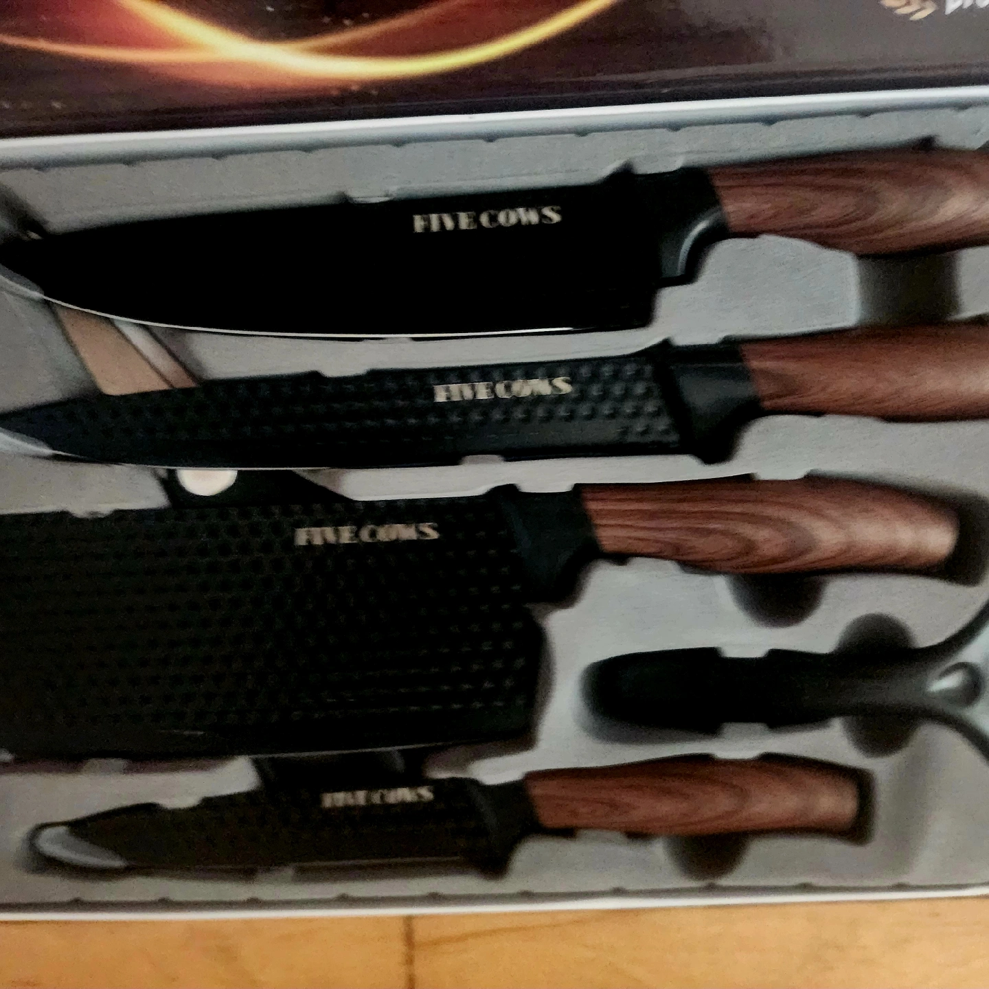 Selling a bran new in box, great for present . Six Cows kitchen knife set, in original box! This premium knife set includes multiple knives and a peeler, scicossr all with the Six Cows logo. The knives feature black blades and wooden handles. Each knife has its own designated place in the set. Pickup near Harlem and Devon Chicago 60631, cash only, thank you