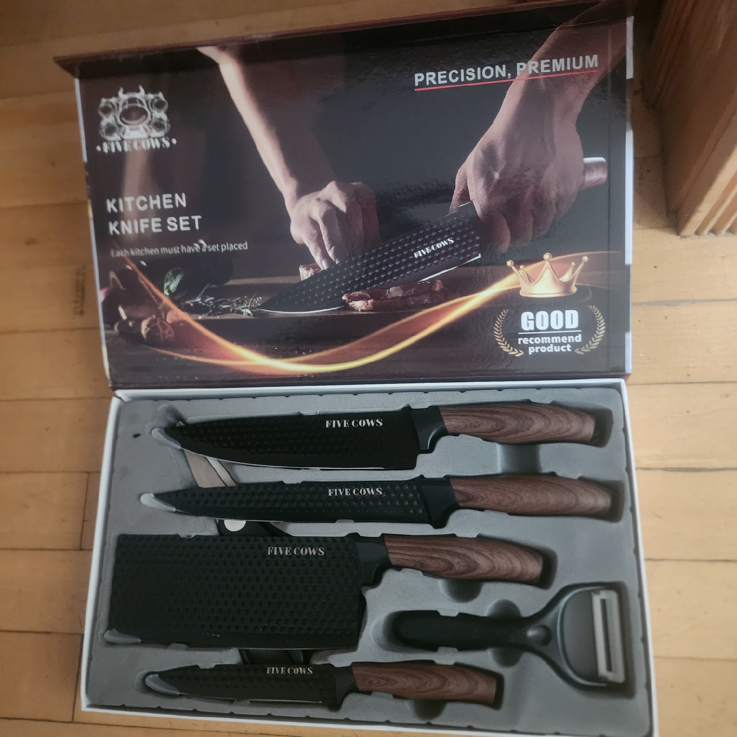 Selling a bran new in box, great for present . Six Cows kitchen knife set, in original box! This premium knife set includes multiple knives and a peeler, scicossr all with the Six Cows logo. The knives feature black blades and wooden handles. Each knife has its own designated place in the set. Pickup near Harlem and Devon Chicago 60631, cash only, thank you