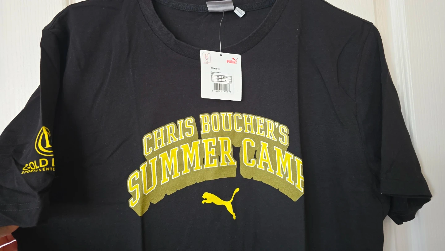 NEW Black Puma t-shirt featuring 'Chris Boucher's Summer Camp' graphic. Includes 'Puma Basketball' logo and a panther graphic on the back. Size medium.