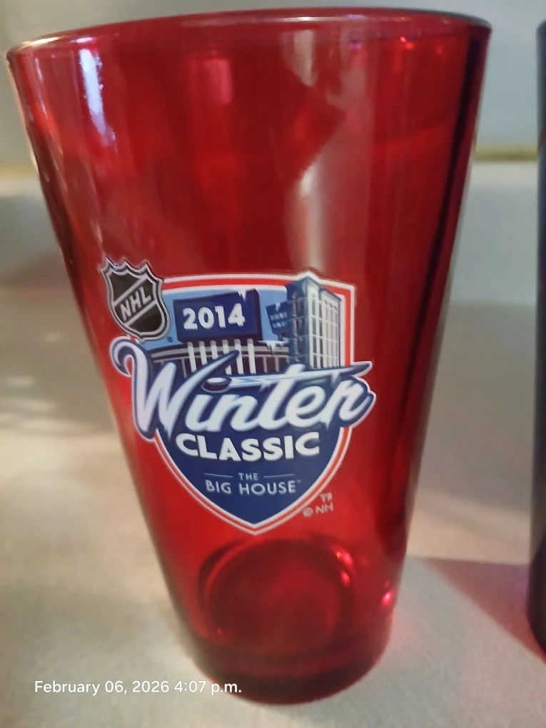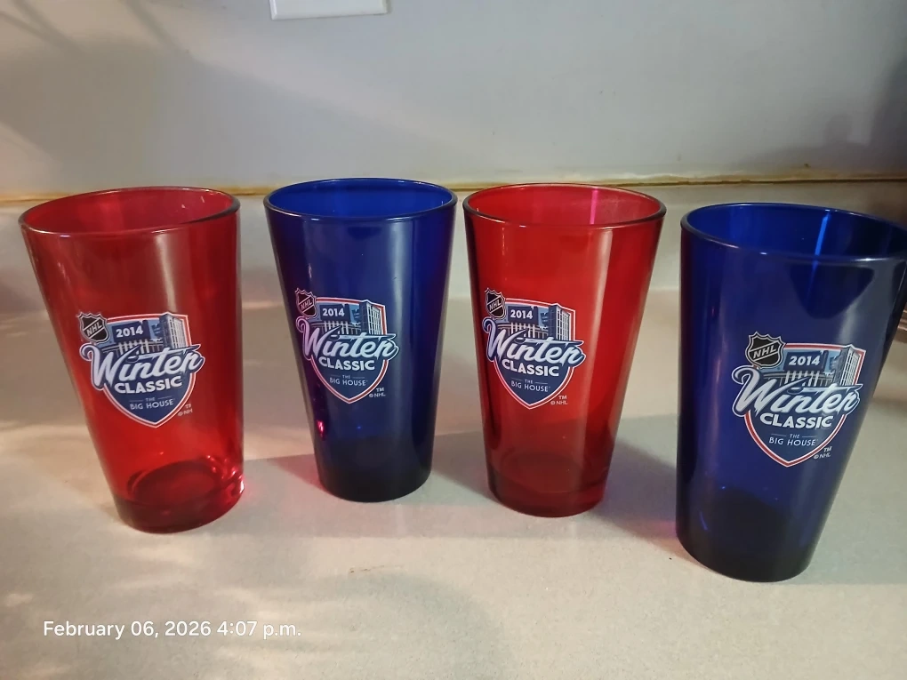 This set includes four collectible cups from the 2014 NHL Winter Classic held at The Big House. Two cups are red and two are blue, featuring the official event logo. Great for any hockey fan!