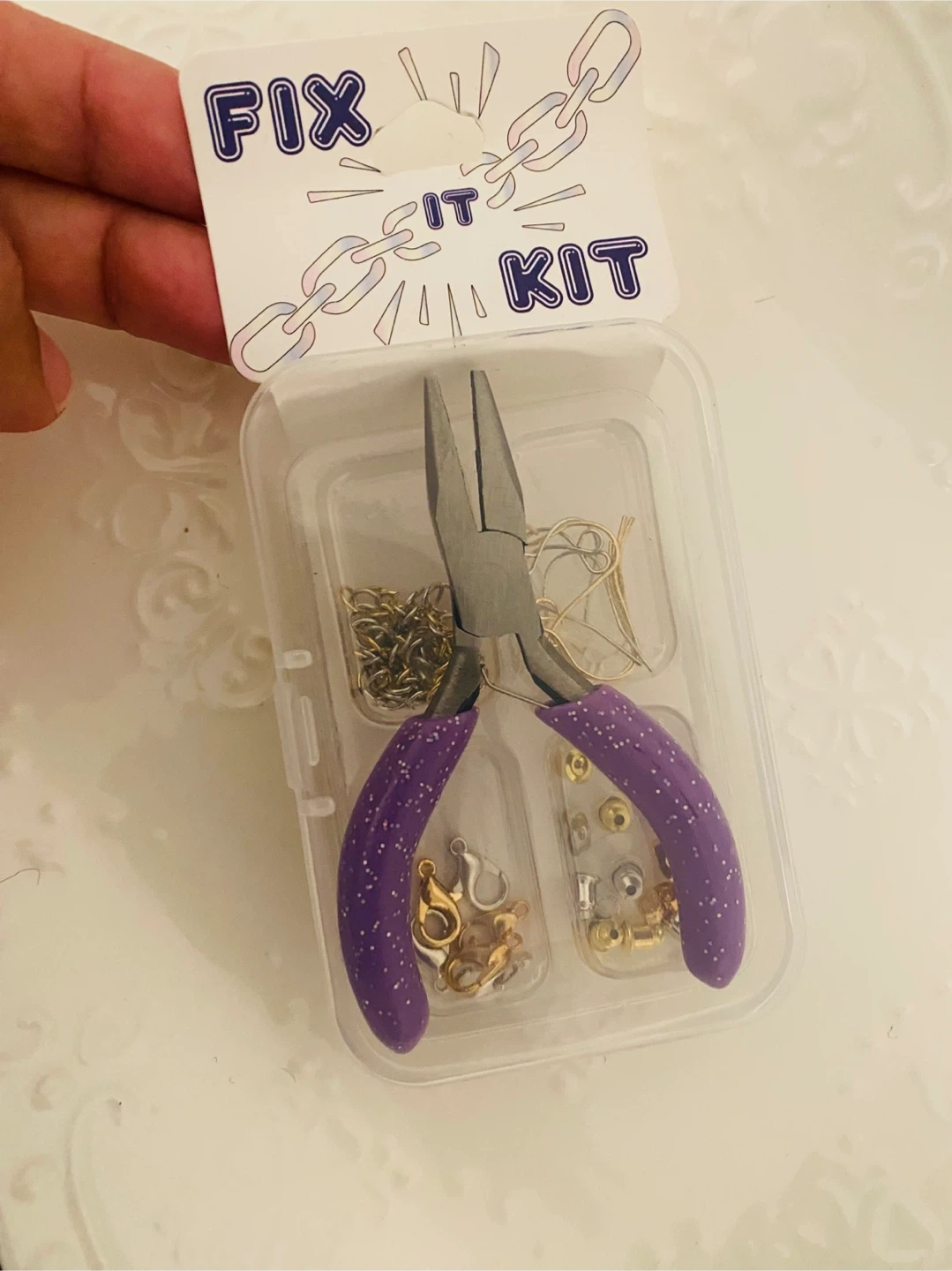 Selling a brand new Fix It Kit Jewellery Repair Kit! This kit includes pliers with purple handles, various clasps, jump rings, and other findings to repair jewellery. Perfect for anyone who enjoys crafting or needs to fix their favourite pieces.
