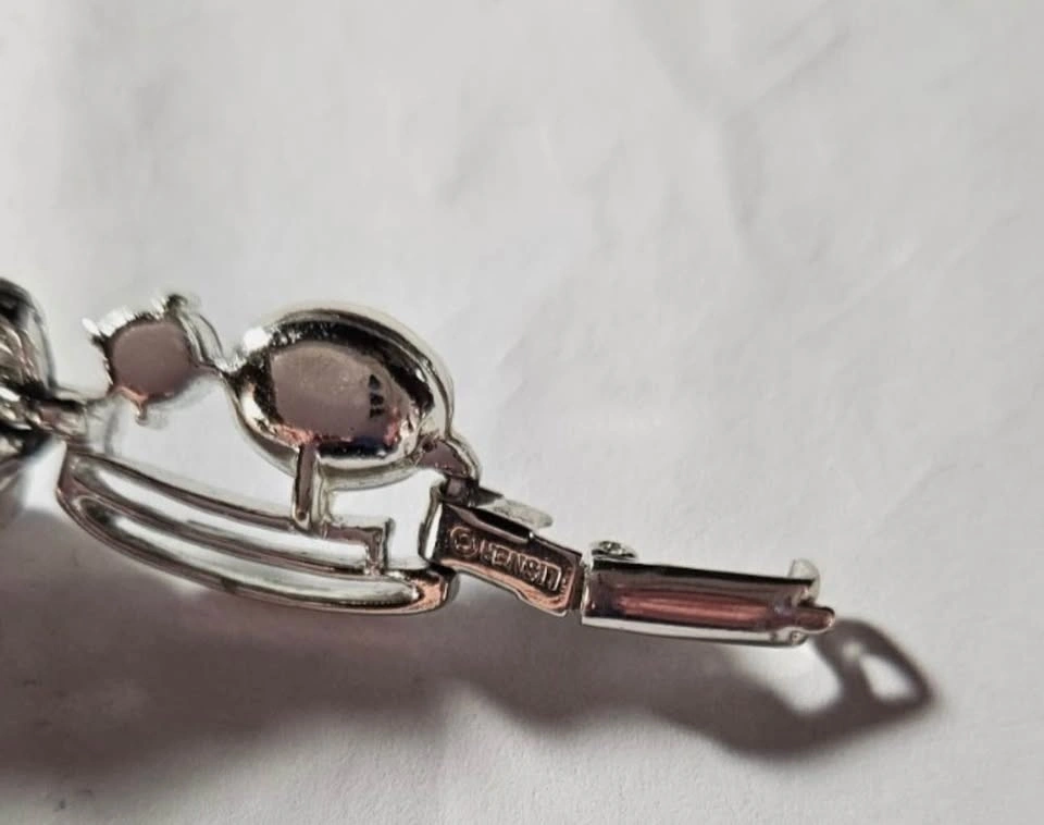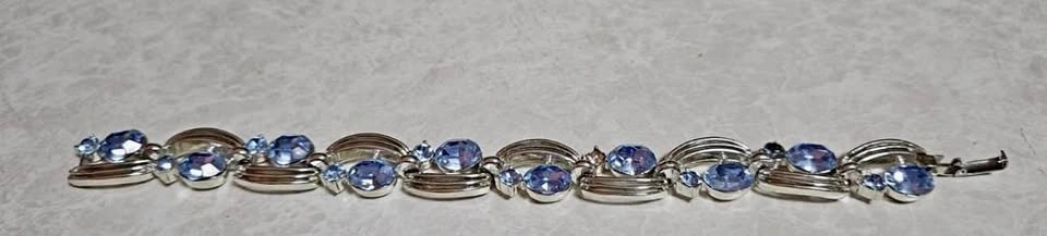 This LISNER silver bracelet features oval aqua blue stones as the main focal point, giving it a elegant and sophisticated look. Lisner stopped production in the mid-1980's. The beautiful blue color of the aquamarine stones adds a touch of luxury and glamour to any outfit, making it a versatile accessory for any occasion. With a length of 7 inches, this bracelet is the perfect size to add a statement to your wrist. This bracelet was given to my mother in the early 1980's. It hasn't been worn since then. It was kept in her jewelry box.