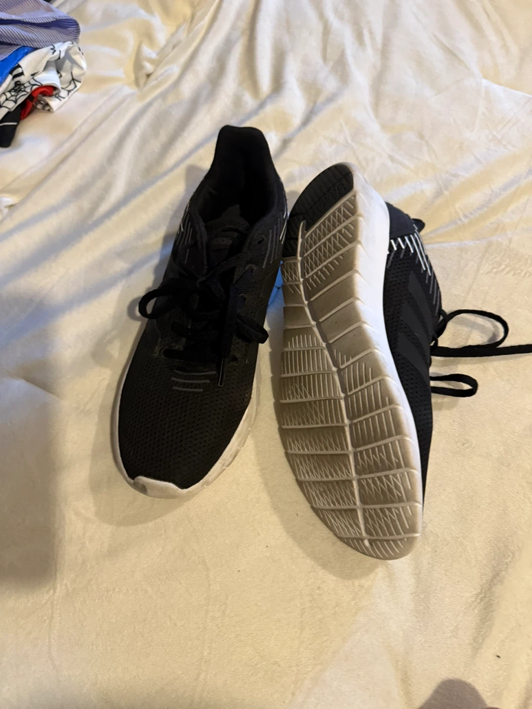 Selling a pair of Adidas running shoes in black. They are in good condition and ready for your next run!