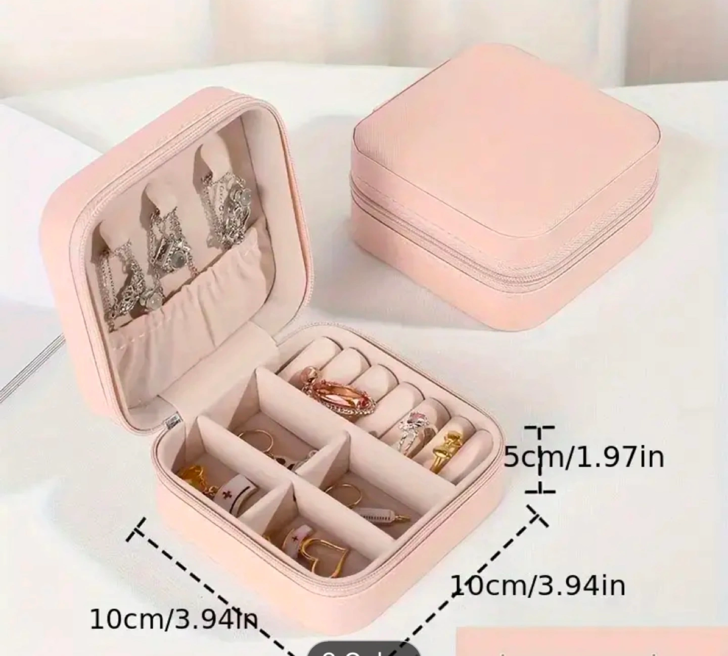 Small, pink, zippered jewelry box. Multiple compartments for storing earrings, rings, necklaces, and other small jewelry.