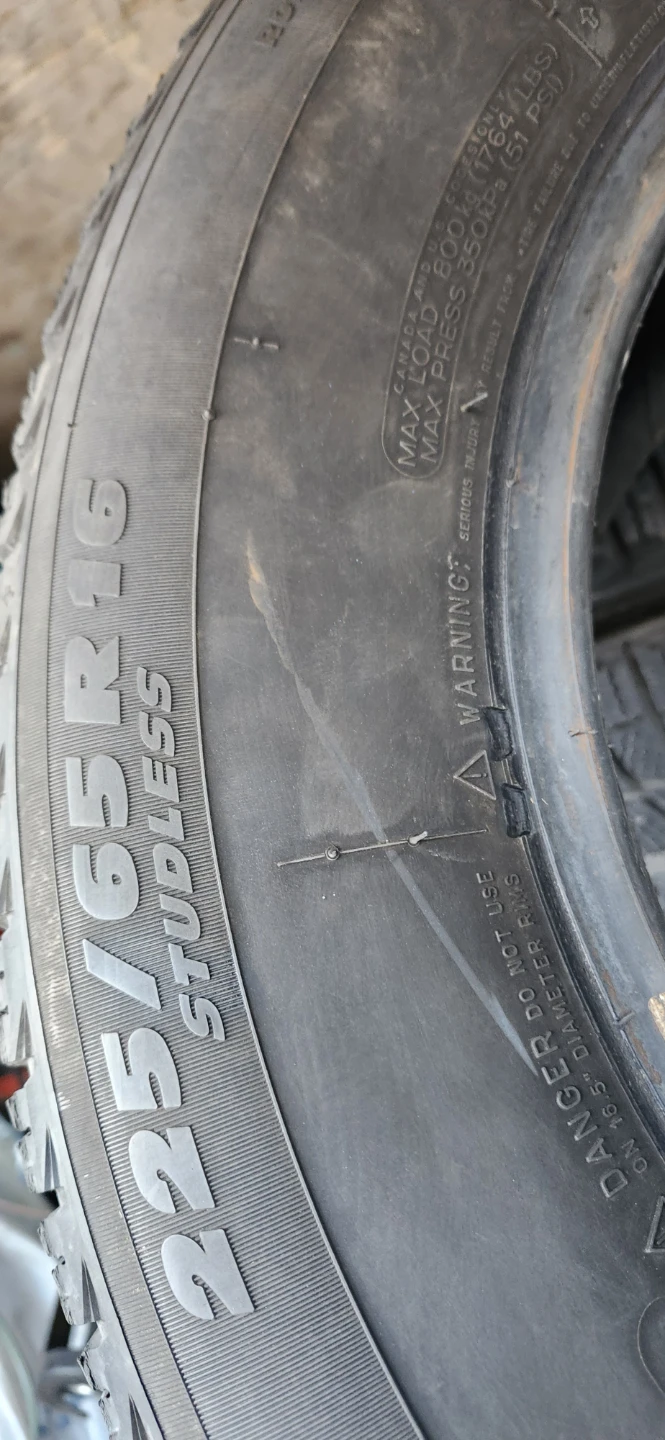 This is one Michelin 225/65R16 studless winter tire. It's a green tire made with 2 polyester, 1 polyamide, and 2 polyester plies. It's designed for cold weather driving. Studless winter tires are great for traction on snow and ice. Price only cash only pickup no delivery 801 O'Connor drive outside TD Canada Trust bank door East York.