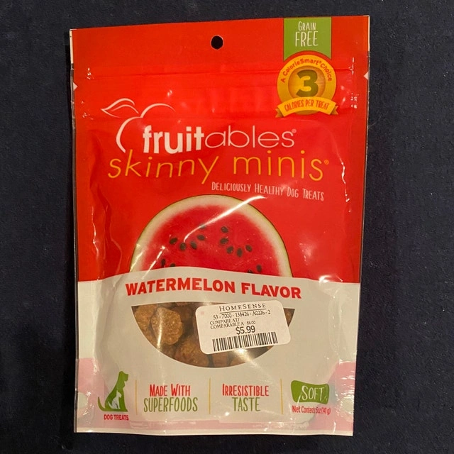 I have two bags of Fruitables Dog Treats, one Pumpkin & Cranberry flavour (90g) and one Watermelon flavour (71g). Both bags are new and unopened, made with superfoods and are irresistibly tasty for your furry friend! Looking to sell both together for $8. Curbside pick up. Cash accepted.