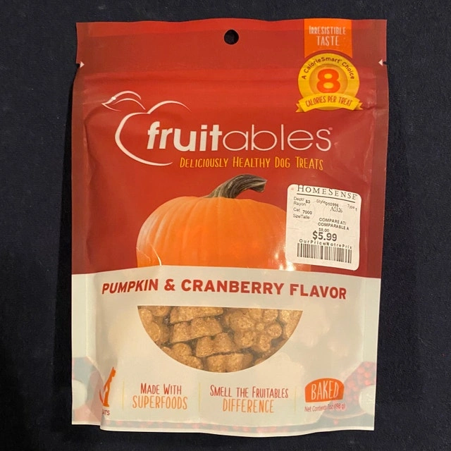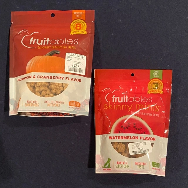 I have two bags of Fruitables Dog Treats, one Pumpkin & Cranberry flavour (90g) and one Watermelon flavour (71g). Both bags are new and unopened, made with superfoods and are irresistibly tasty for your furry friend! Looking to sell both together for $8. Curbside pick up. Cash accepted.