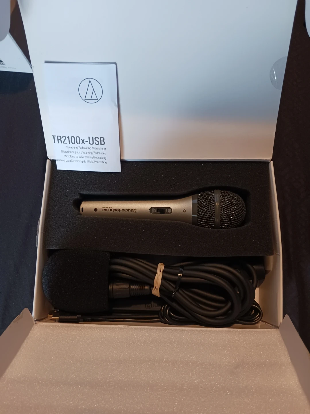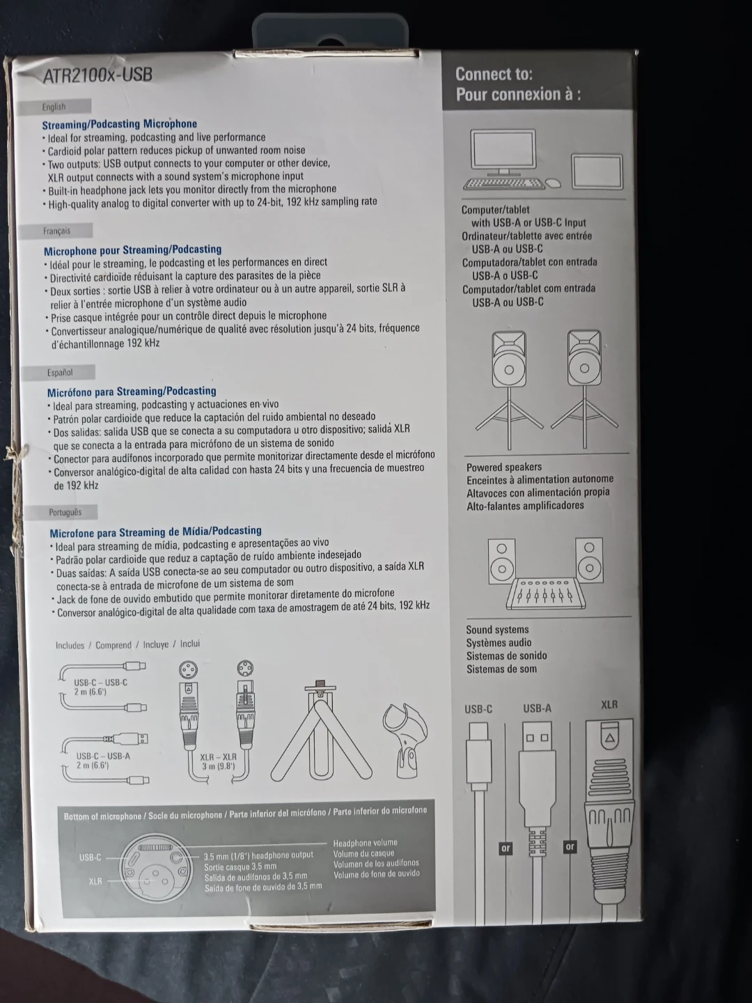 This is the Audio-Technica ATR2100x-USB microphone, ideal for streaming and podcasting. It offers both USB and XLR connections for versatile use. The microphone features a cardioid polar pattern, reducing pickup of unwanted sound. It includes a tripod stand and essential cables for immediate setup. This mic is great for content creators and voice professionals!