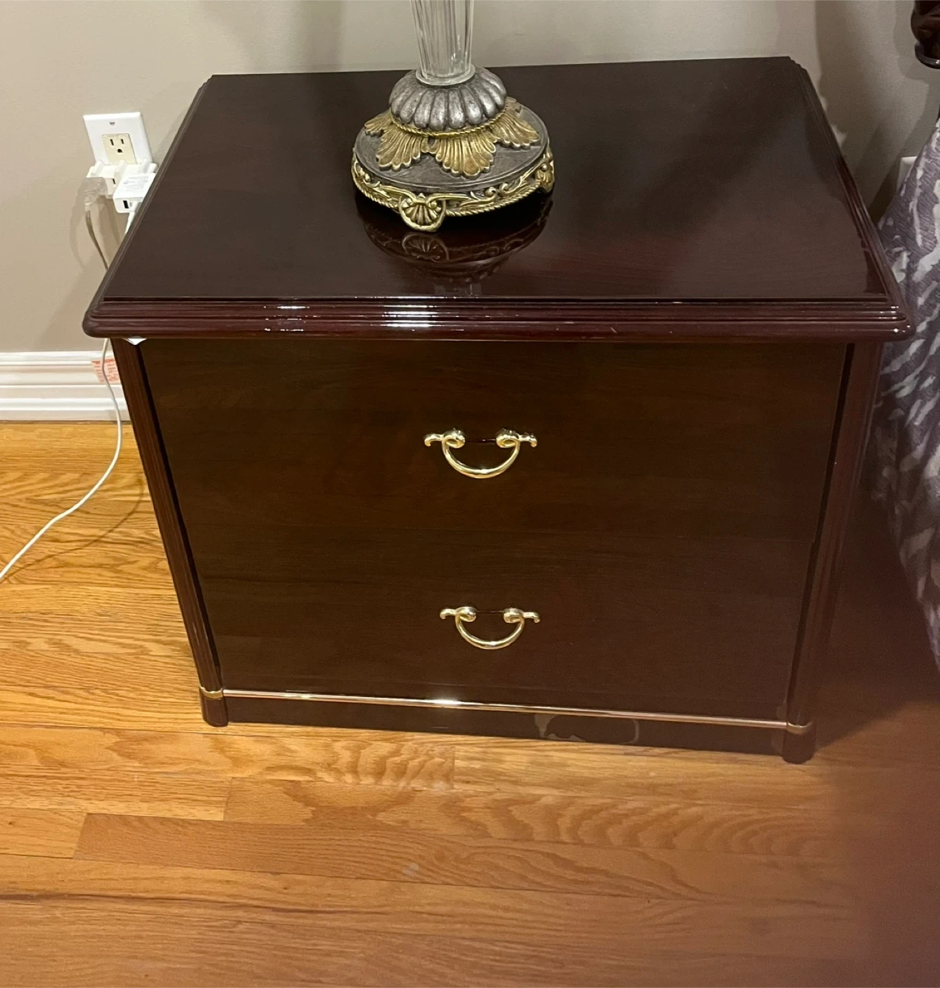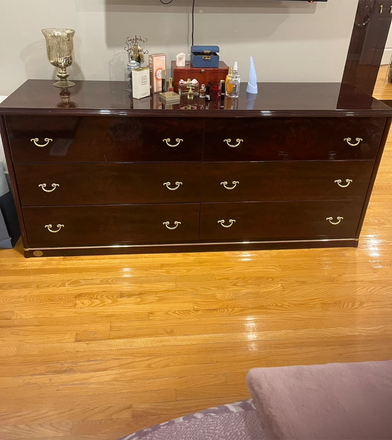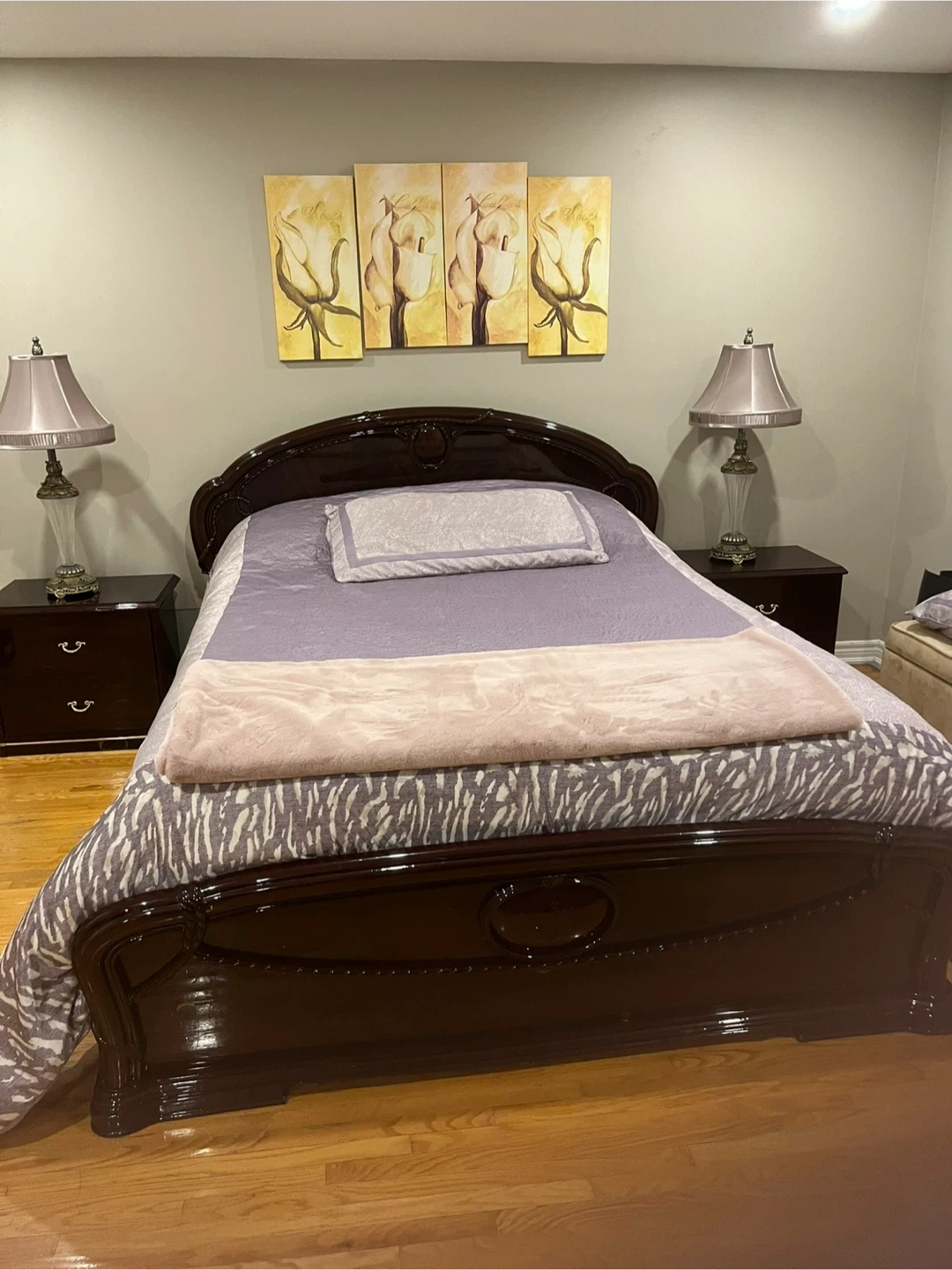 Queen bed (mattress not included) spacious dresser with a dark, glossy finish. It features six drawers with brass hardware. Perfect for storing clothes and linens. And 2 night tables.