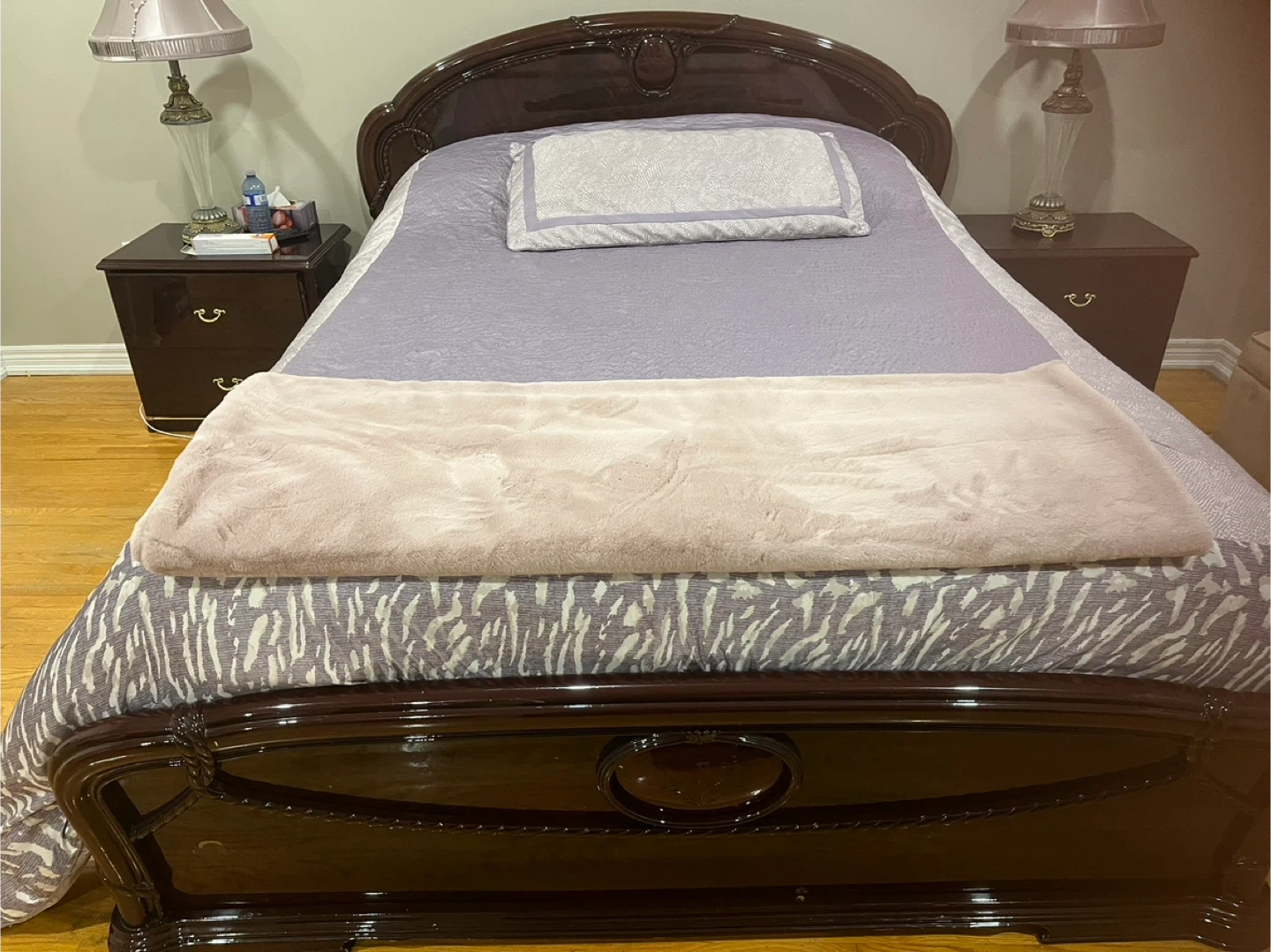Queen bed (mattress not included) spacious dresser with a dark, glossy finish. It features six drawers with brass hardware. Perfect for storing clothes and linens. And 2 night tables.