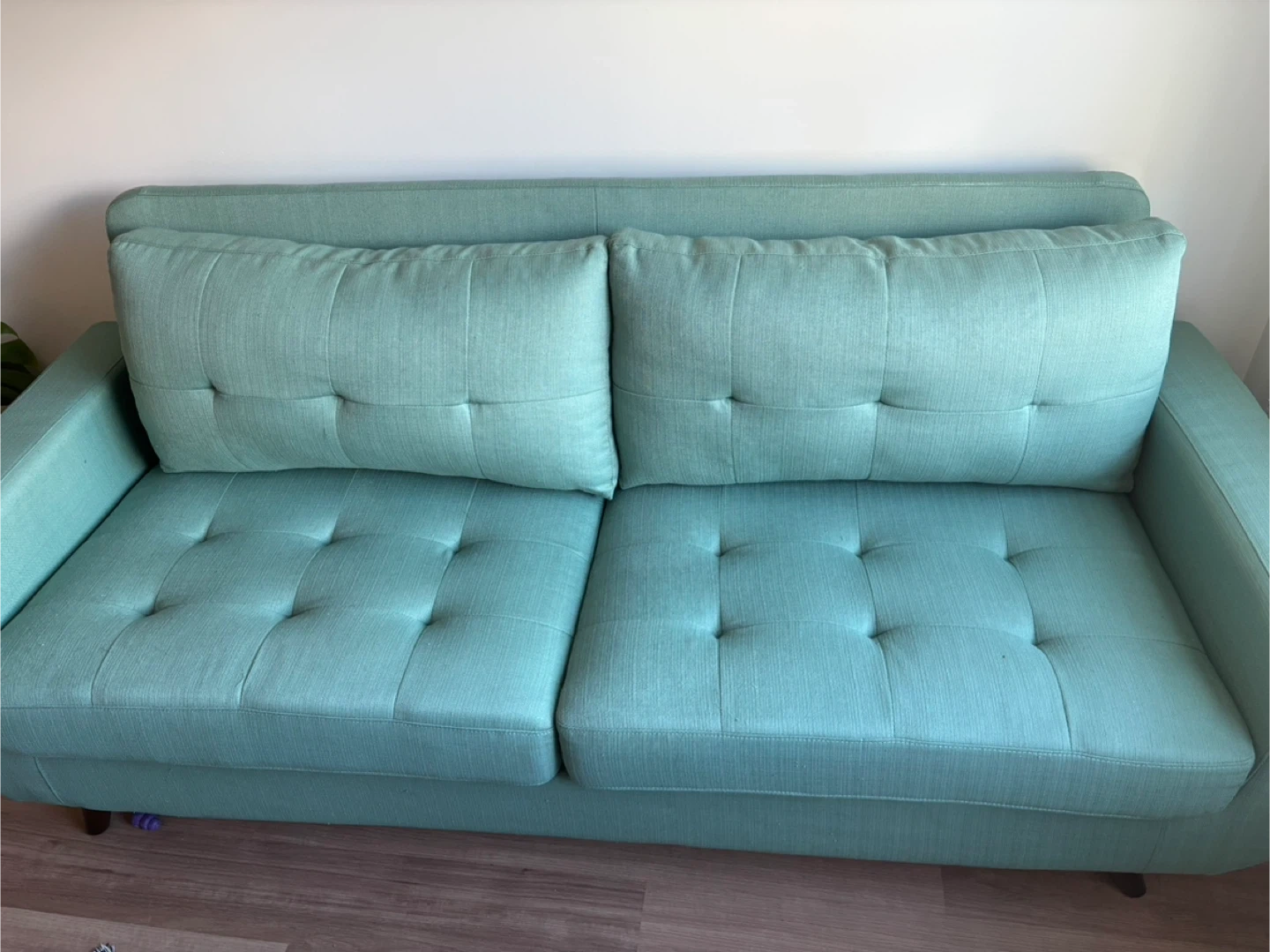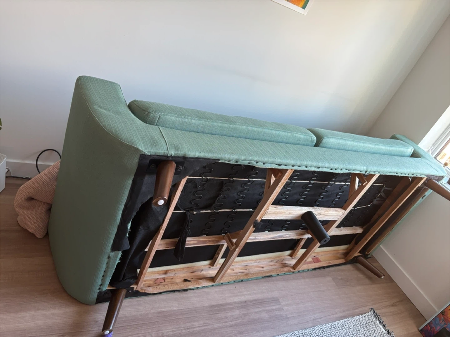 The fabric on the bottom is missing as pictured in the second to last photo. Legs are detachable and come with the sofa in a separate bag (to make it easier to take down my building’s elevator).
