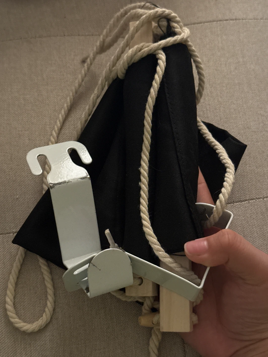 A black under desk hammock with ropes and metal clips. It's designed to attach to the underside of a desk. Great for relaxing your feet during work!