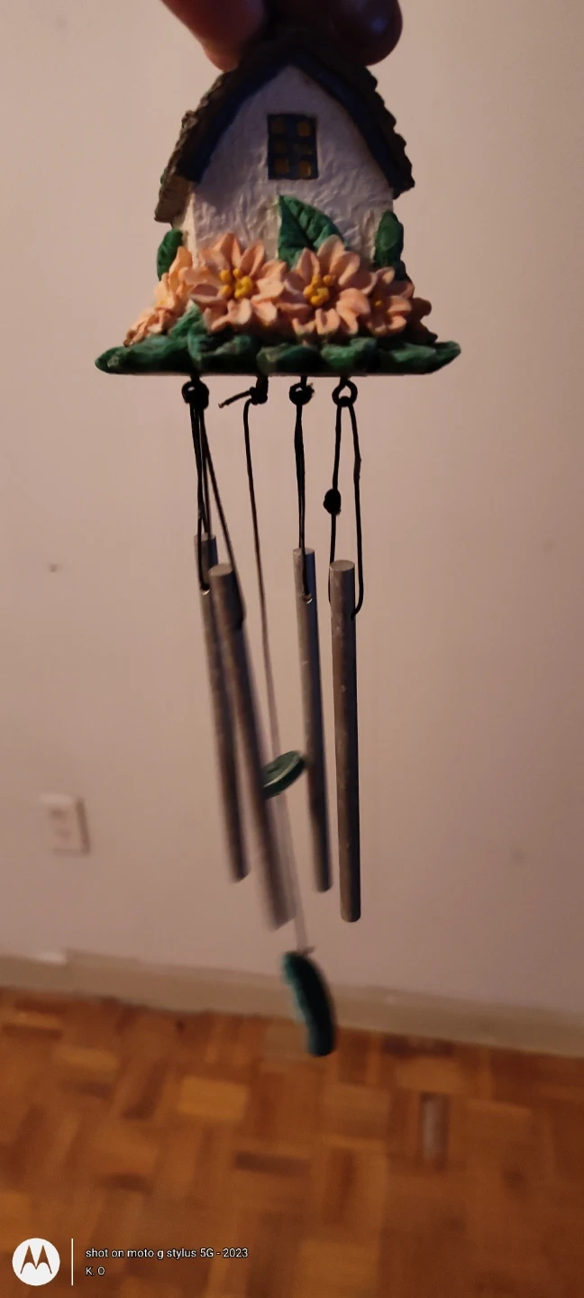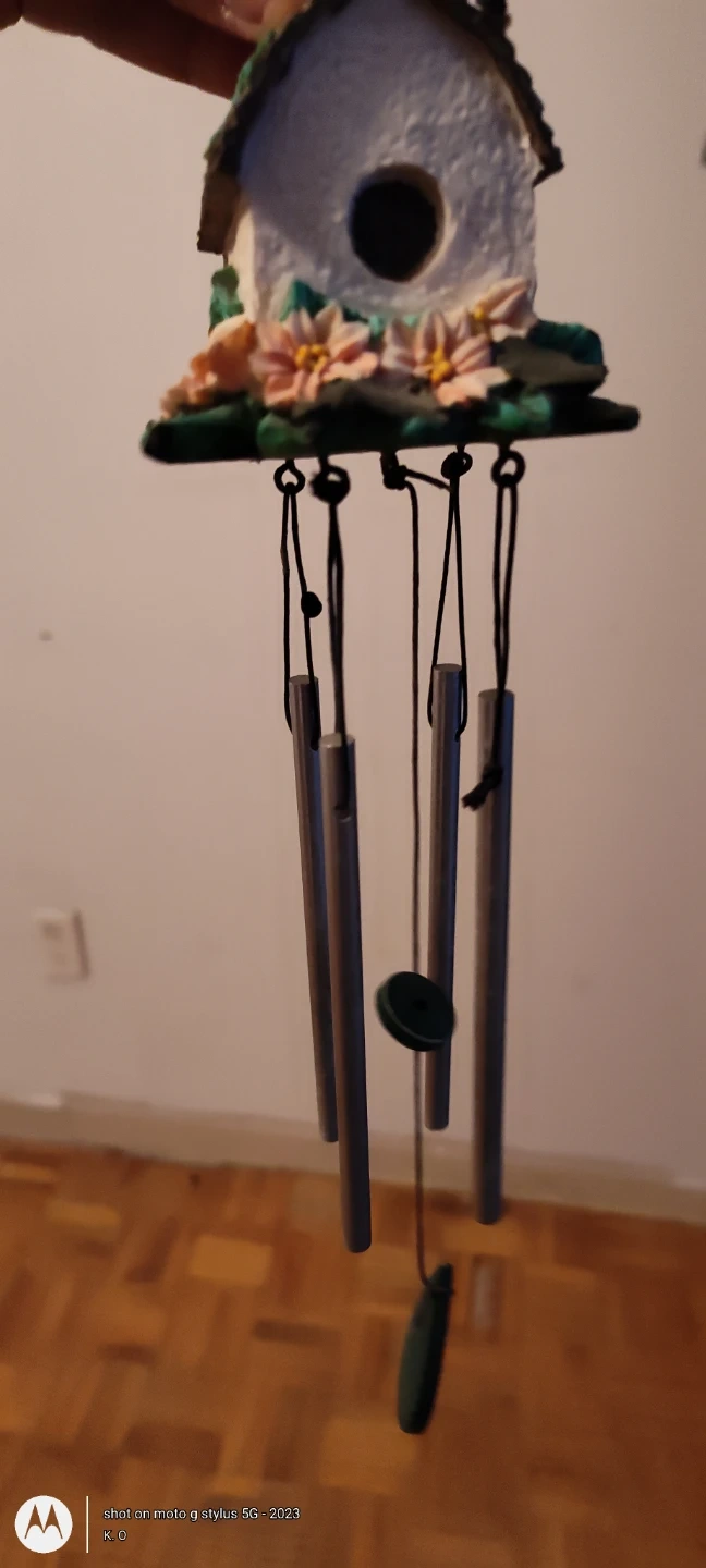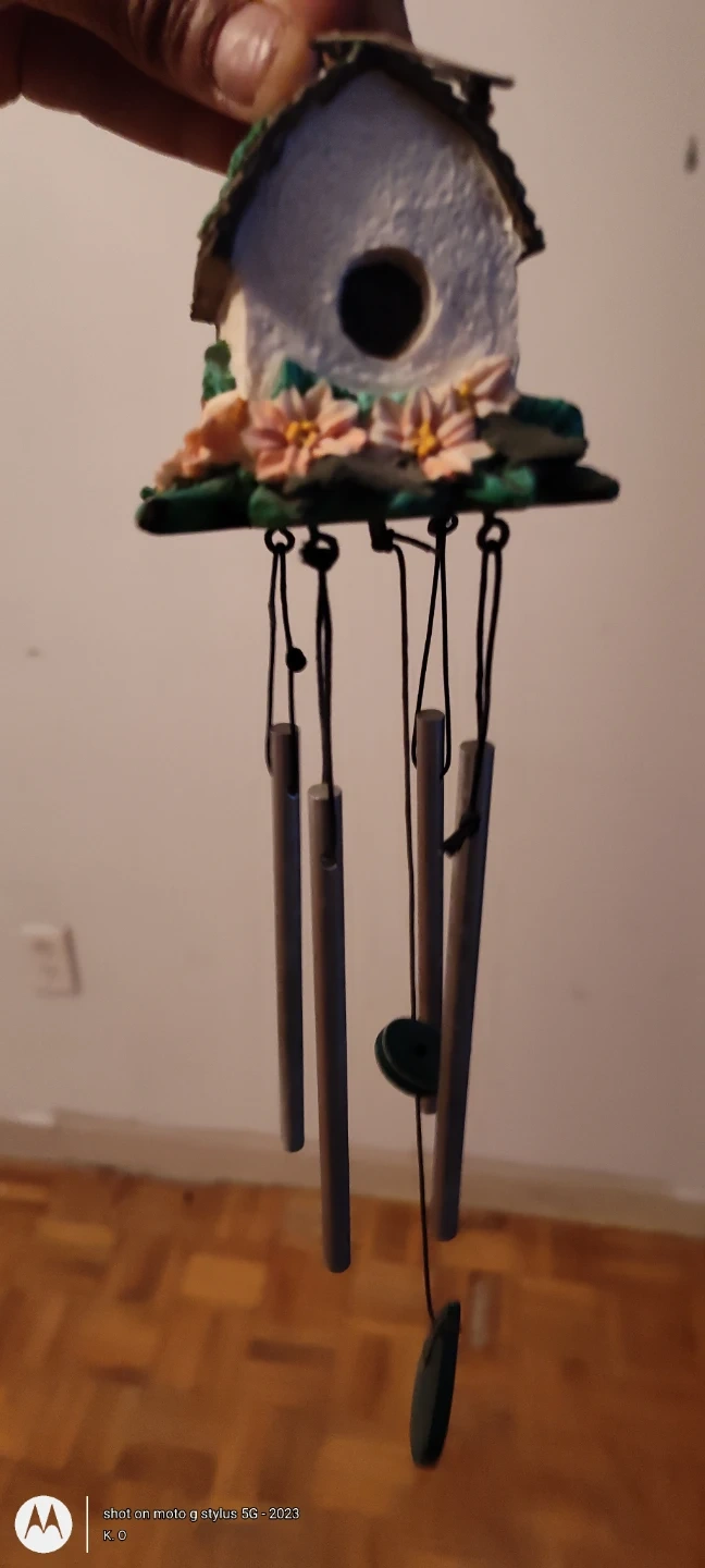 This used and good condition decorative wind chime features a charming birdhouse-style top adorned with pink flowers.
