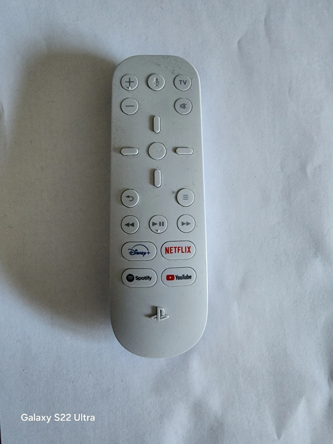 White PlayStation 5 media remote. Includes Netflix, Disney+, Spotify, and YouTube buttons. Comes with original case. Pre-owned.