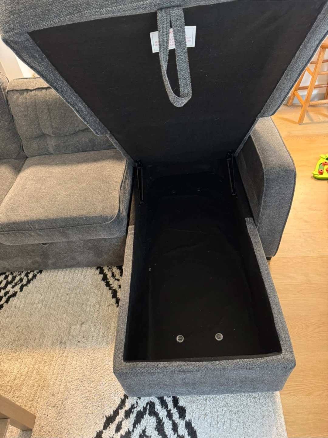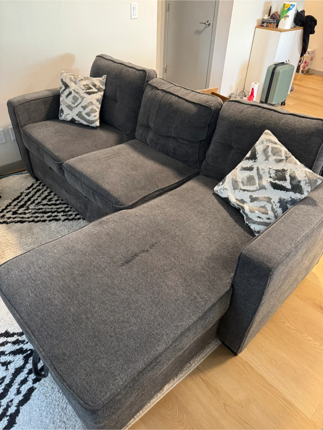 Grey fabric sectional sofa. Includes storage space in the chaise. Comes with two accent pillows.