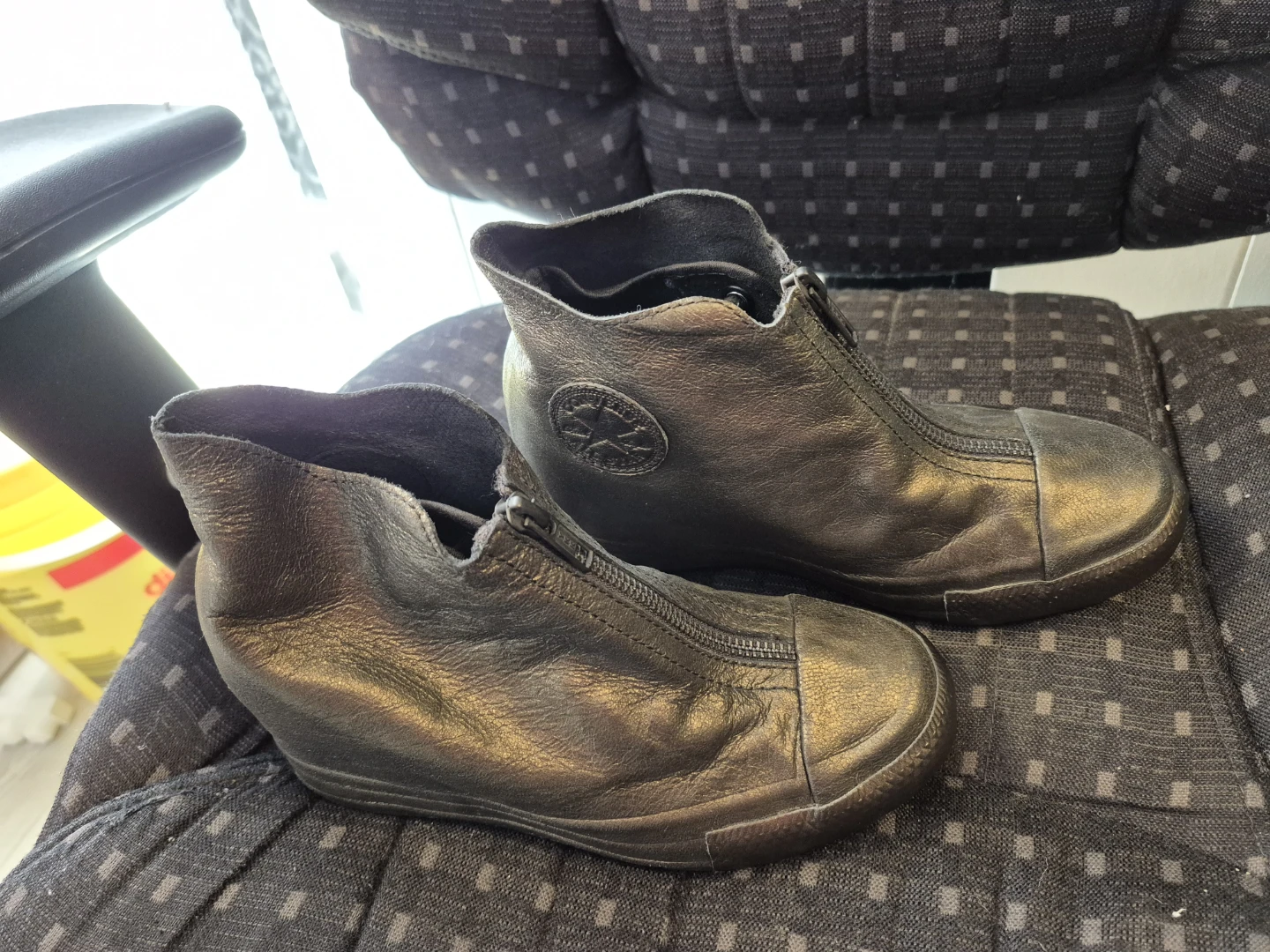 Black leather Converse wedge high-top sneakers with a side zipper. Features the classic Converse star logo on the side. This style combines the look of a sneaker with the added height of a wedge.