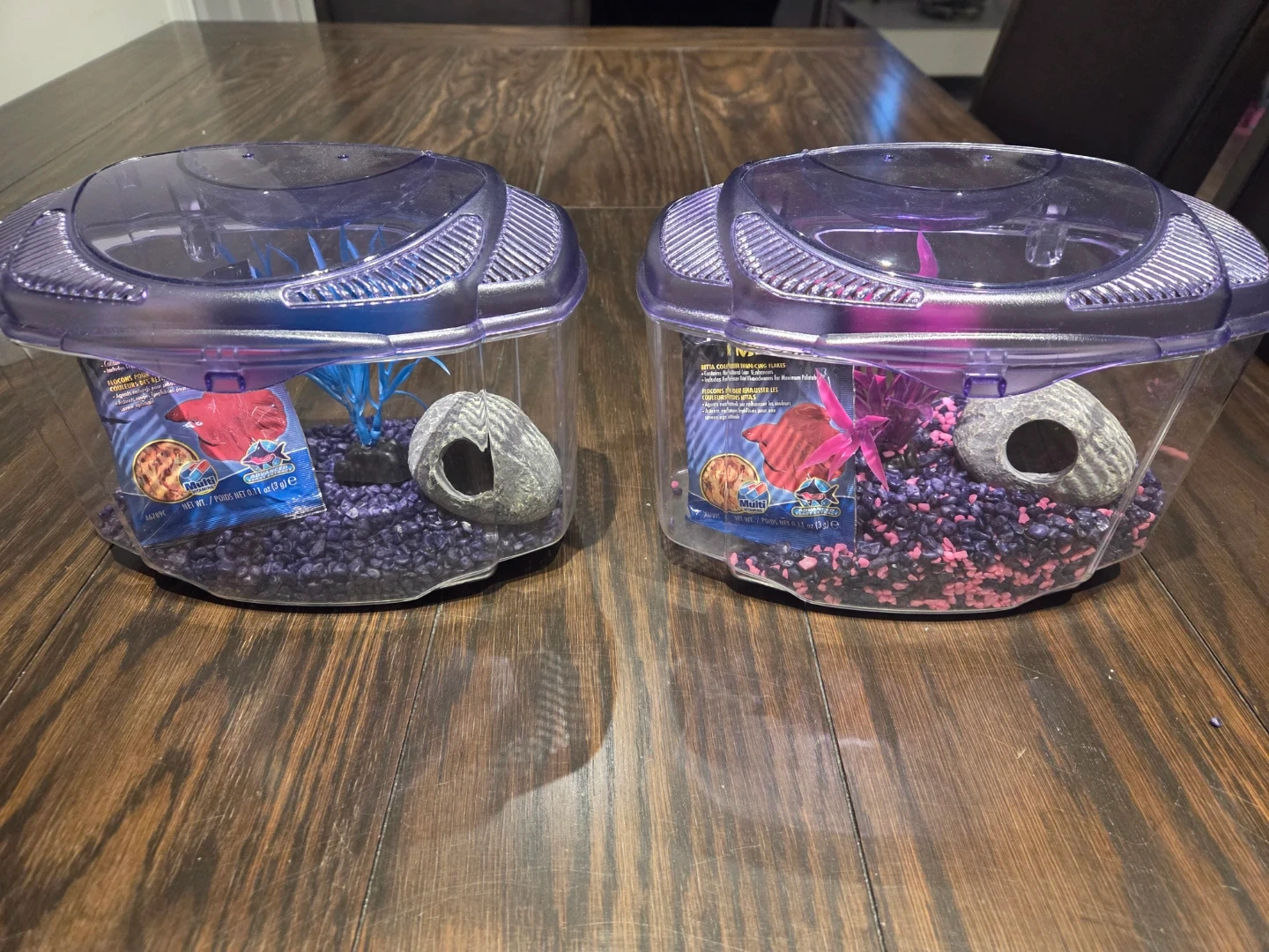 This is a compact betta fish tank kit. It includes fish food flakes, gravel, and a decorative hideout. It's perfect for a single betta fish or as a starter aquarium.