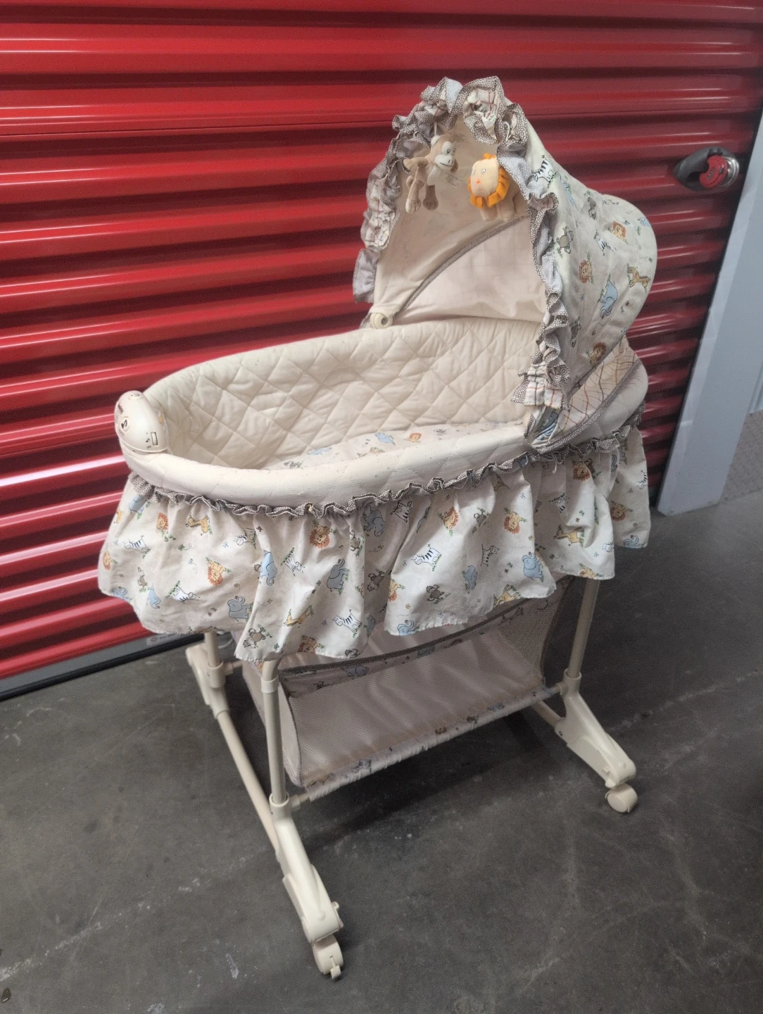 Infant bassinet in a cream colour with a cute animal print. It features a comfortable quilted mattress and a canopy with hanging toys. It also has a music and sound unit attached. This bassinet is perfect for keeping your newborn close by.