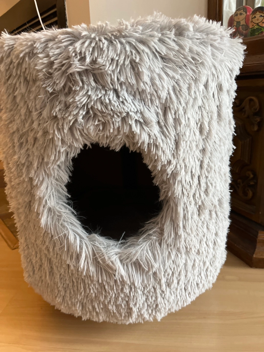 This cozy grey cat cave bed is perfect for your furry friend! It's made of soft, furry material and features a cute little entrance. The bed also has small wooden legs to keep it off the floor. Your cat will love snuggling up in this comfy cave!