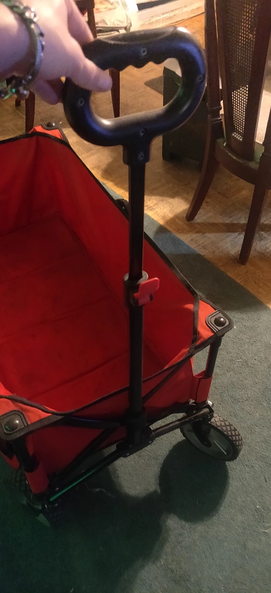 Folding wagon with an extendable handle and multiple large pockets/drink holders. Wheels are black with grey hubs. Red interior and exterior, folds away for easy storage and can hold heavy weights.