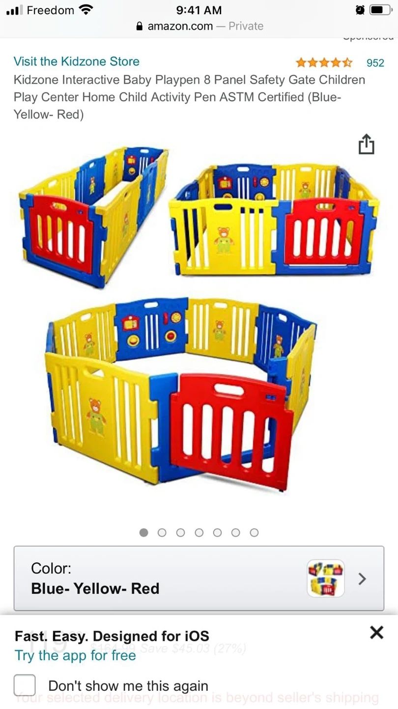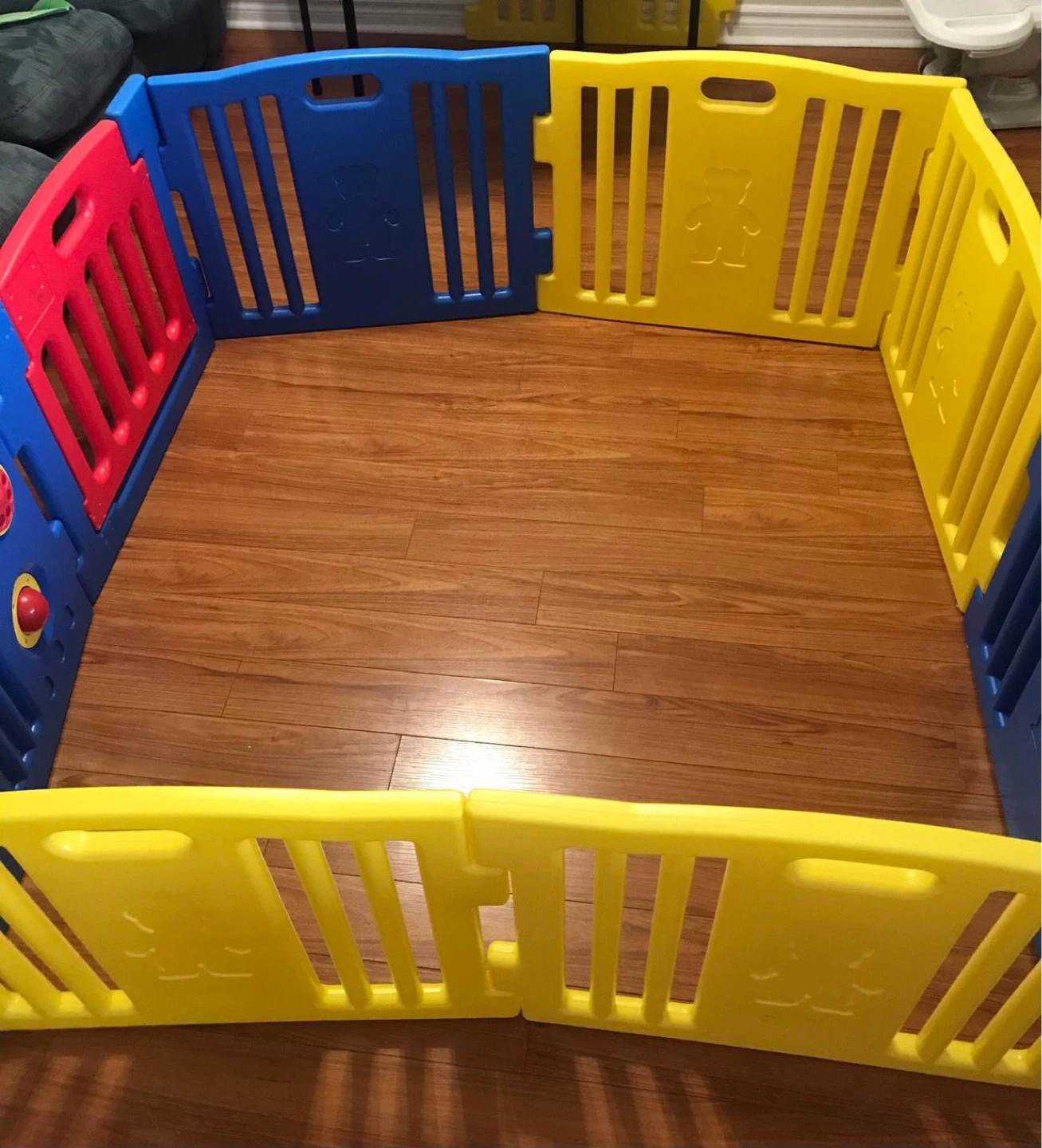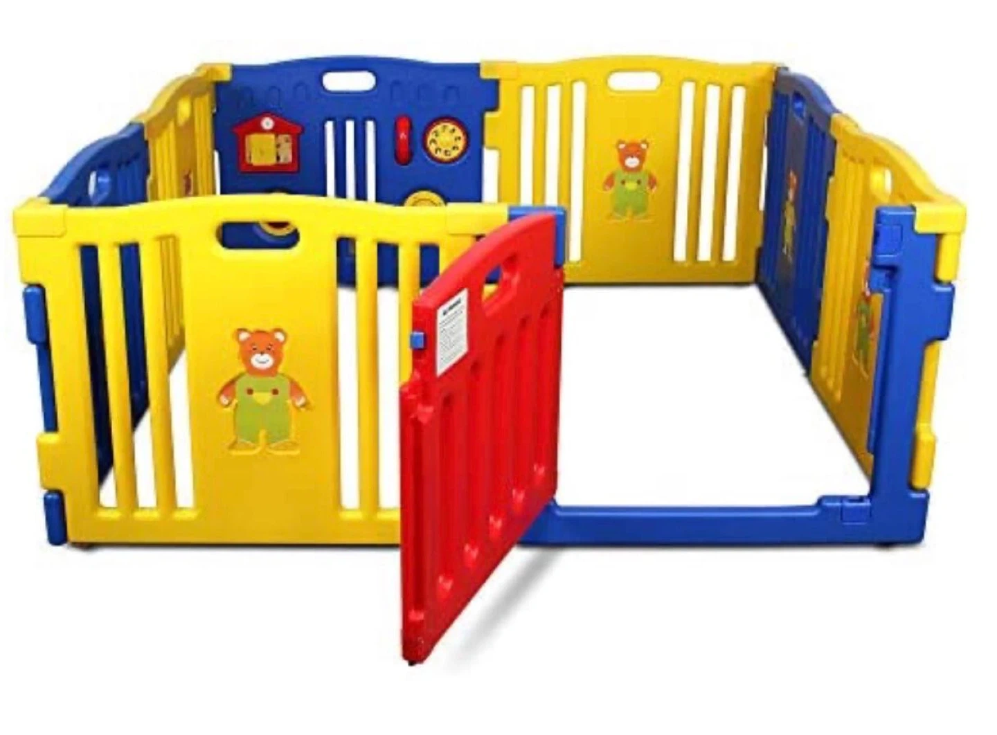 This is an 8-panel interactive playpen for children. It features a safety gate . The panels are blue, yellow, and red.