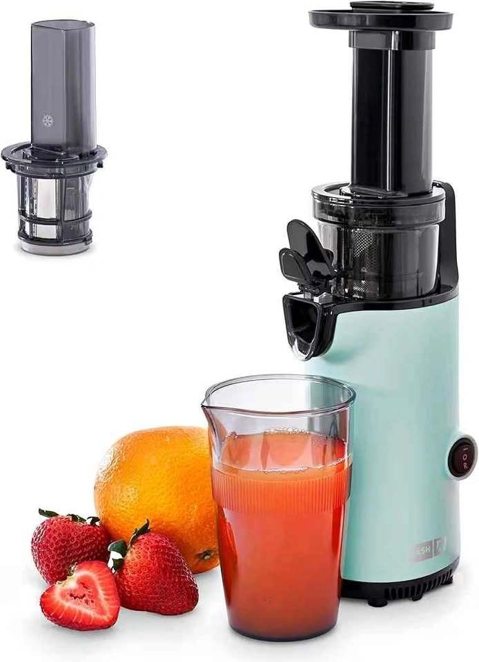 Used in good condition DASH Deluxe Compact Masticating Slow Juicer. Easy to clean, cold press juicer. Includes pulp measuring cup and frozen attachment. Color: Aqua.