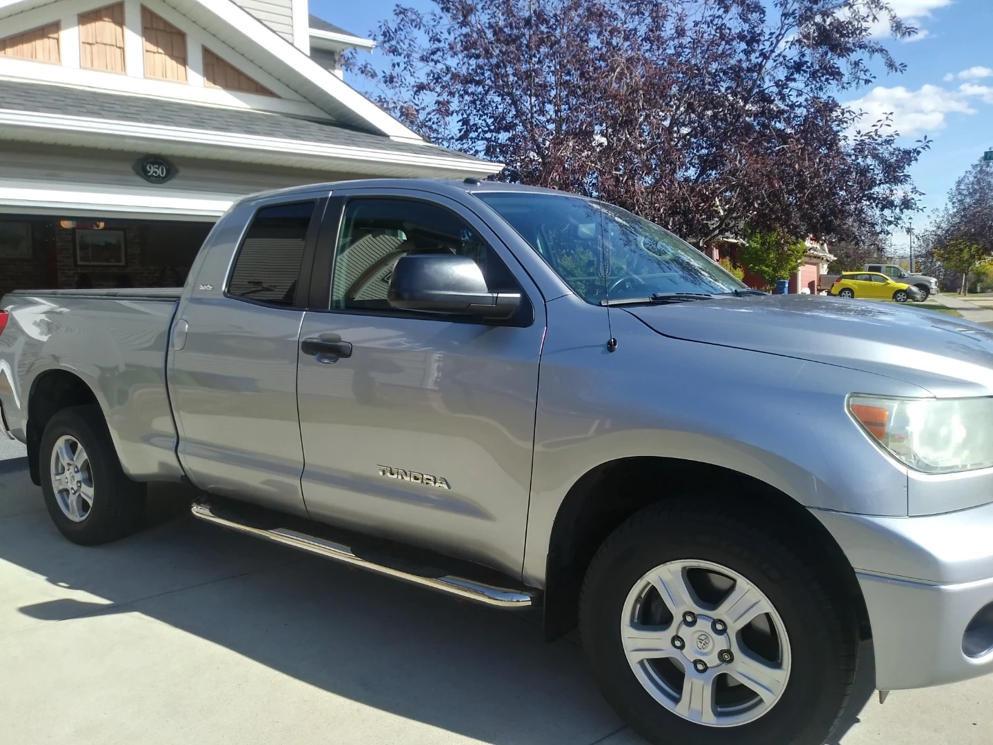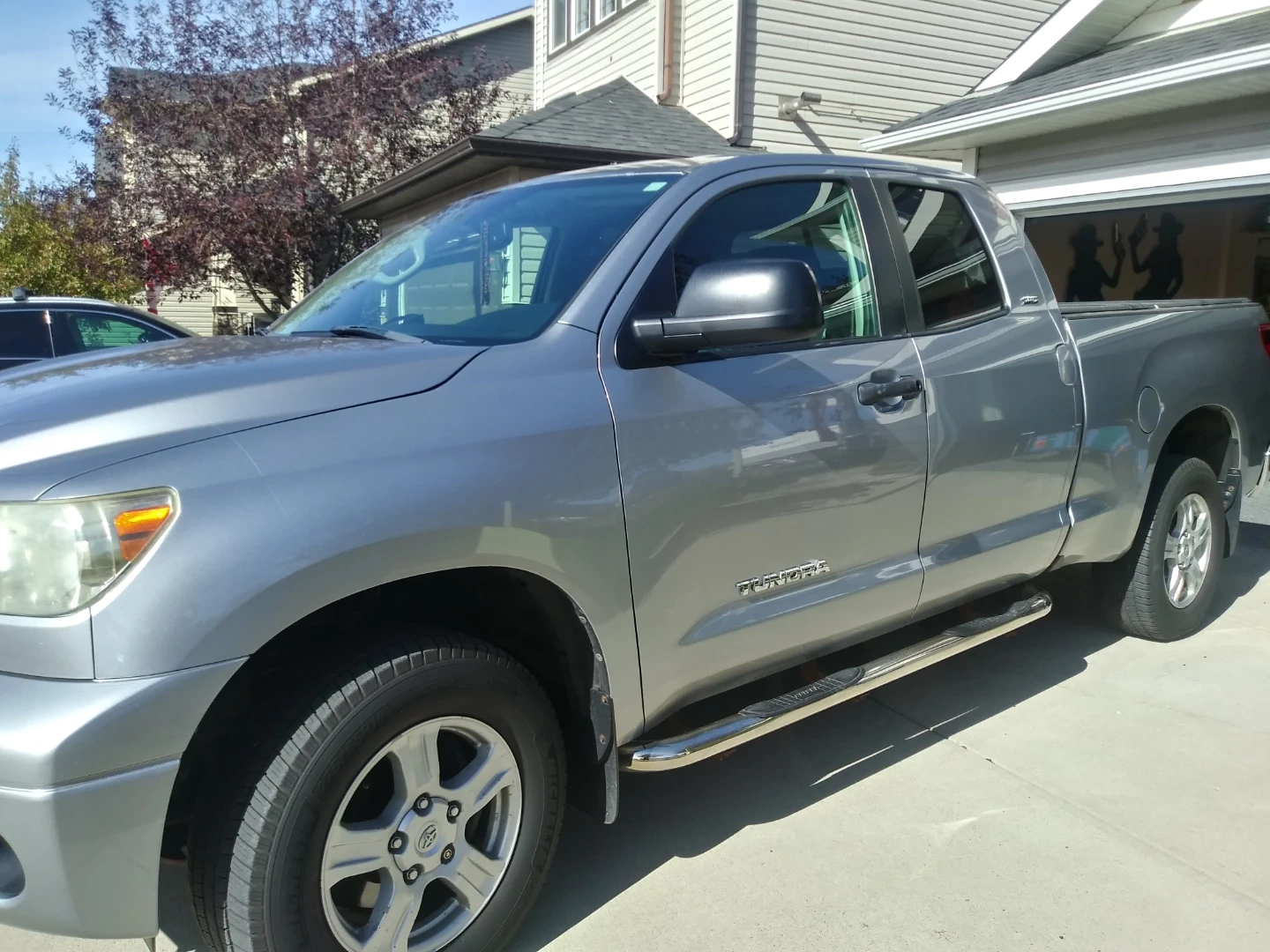 Silver Toyota Tundra pickup truck. Four-door crew cab model. Features include running boards and a tonneau cover. Interior shows cloth seats and floor mats. 2011 4×4 SR5 with 176000 kms extremely clean none smoker and no accidents