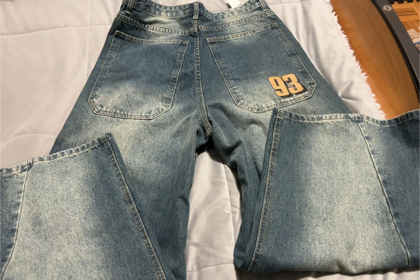 These UH DENIM jeans are a size 28. They feature a mega baggy fit with a distressed blue wash. The back pockets have a "93" detail on the back.