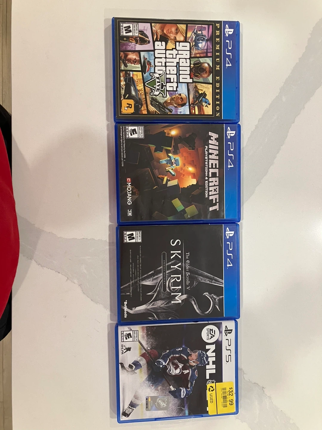Selling four PS4 games: Grand Theft Auto V Premium Edition, Minecraft PlayStation 4 Edition, The Elder Scrolls V Skyrim Special Edition, and NHL. Games are for PlayStation 4 console. And ps5 NHL 24