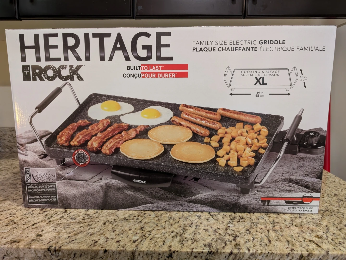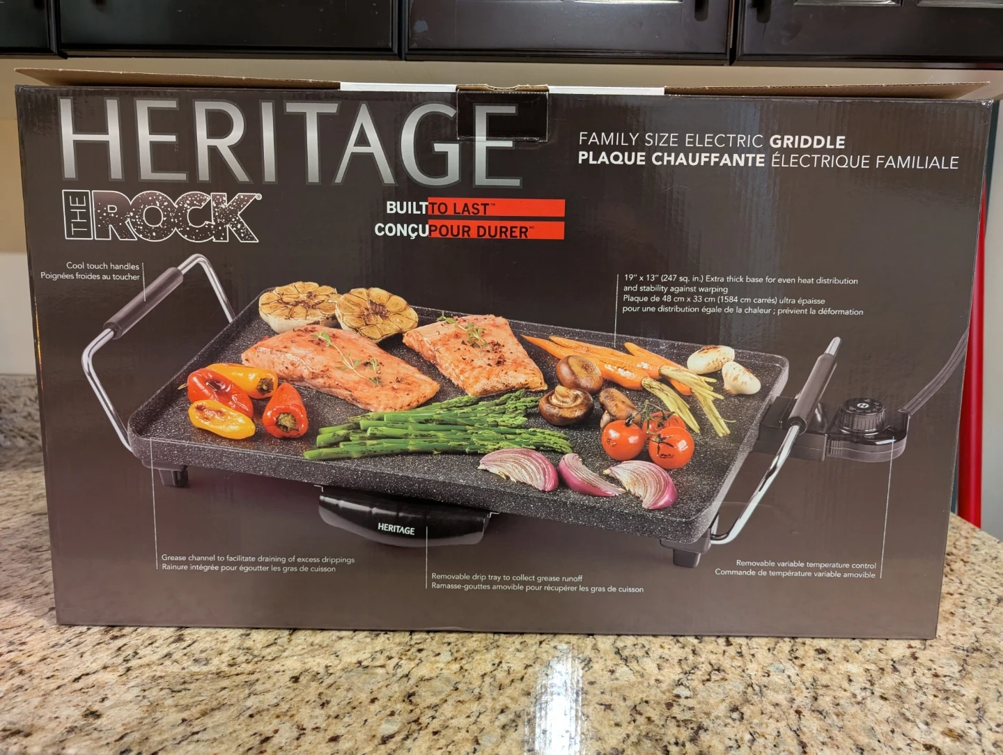 This is a family-sized electric griddle by Heritage. It's built to last and features a non-stick surface for easy cooking. The cooking surface measures 19" x 13" and has a thick base for even heat distribution. It includes a removable drip tray and adjustable temperature control.
