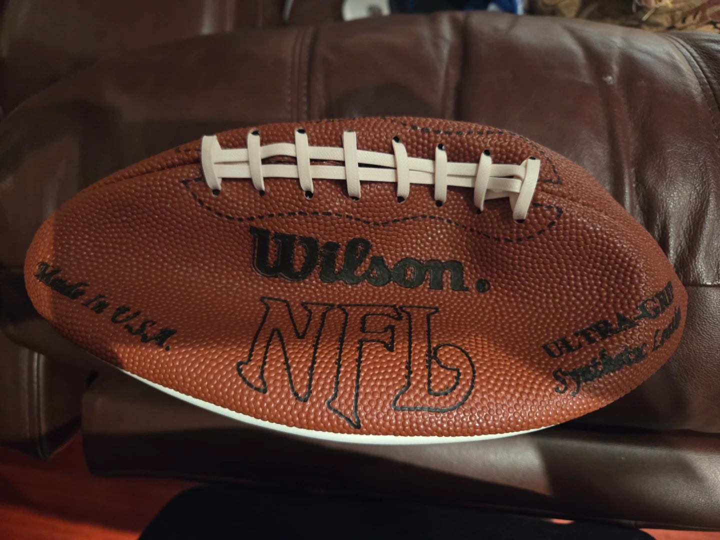 Wilson NFL football, featuring the Quarterback Club logo and multiple signatures. It's made in the U.S.A. and has Ultra-Grip synthetic leather. This ball would be a great addition for any football memorabilia collector! No.