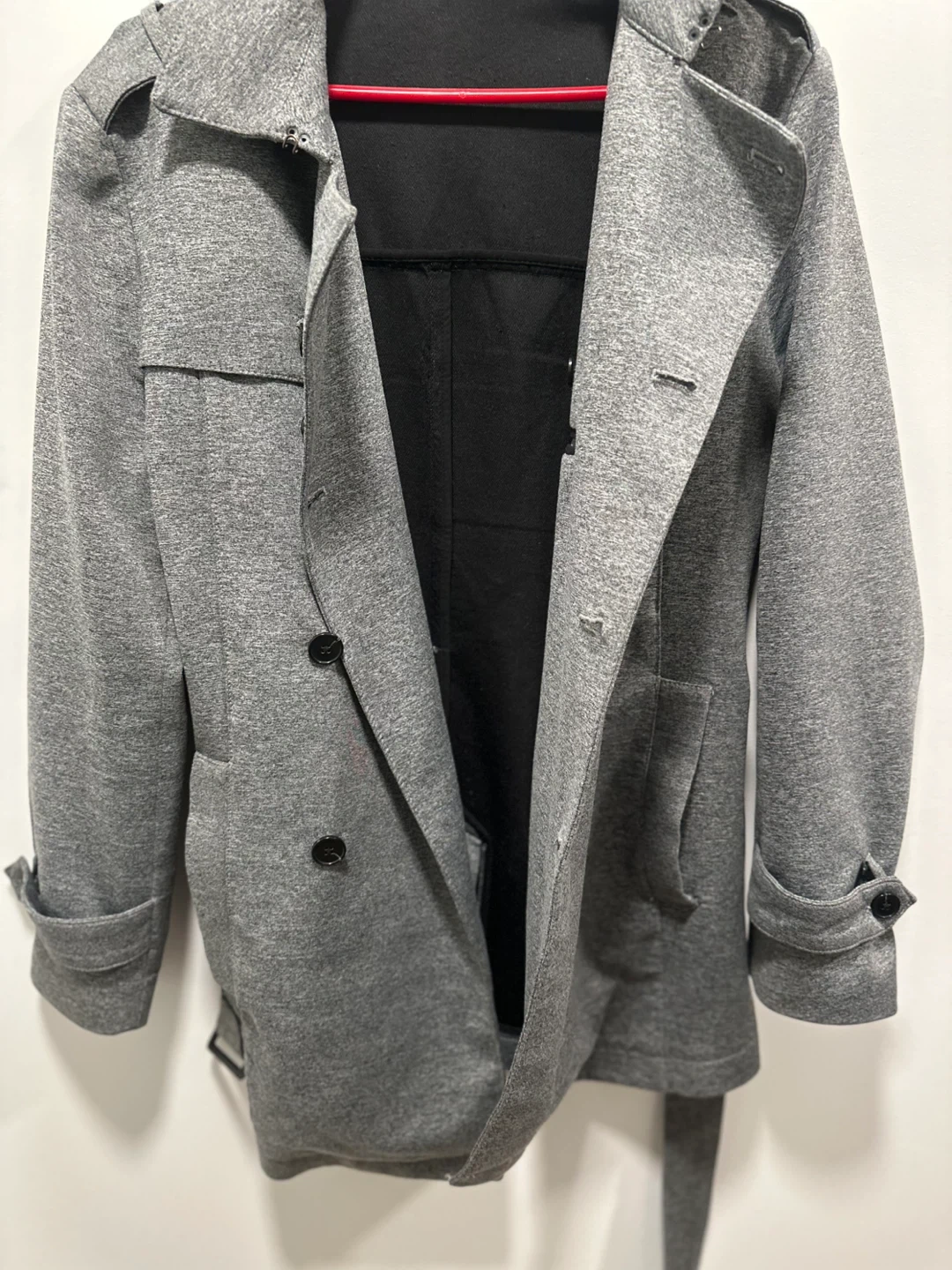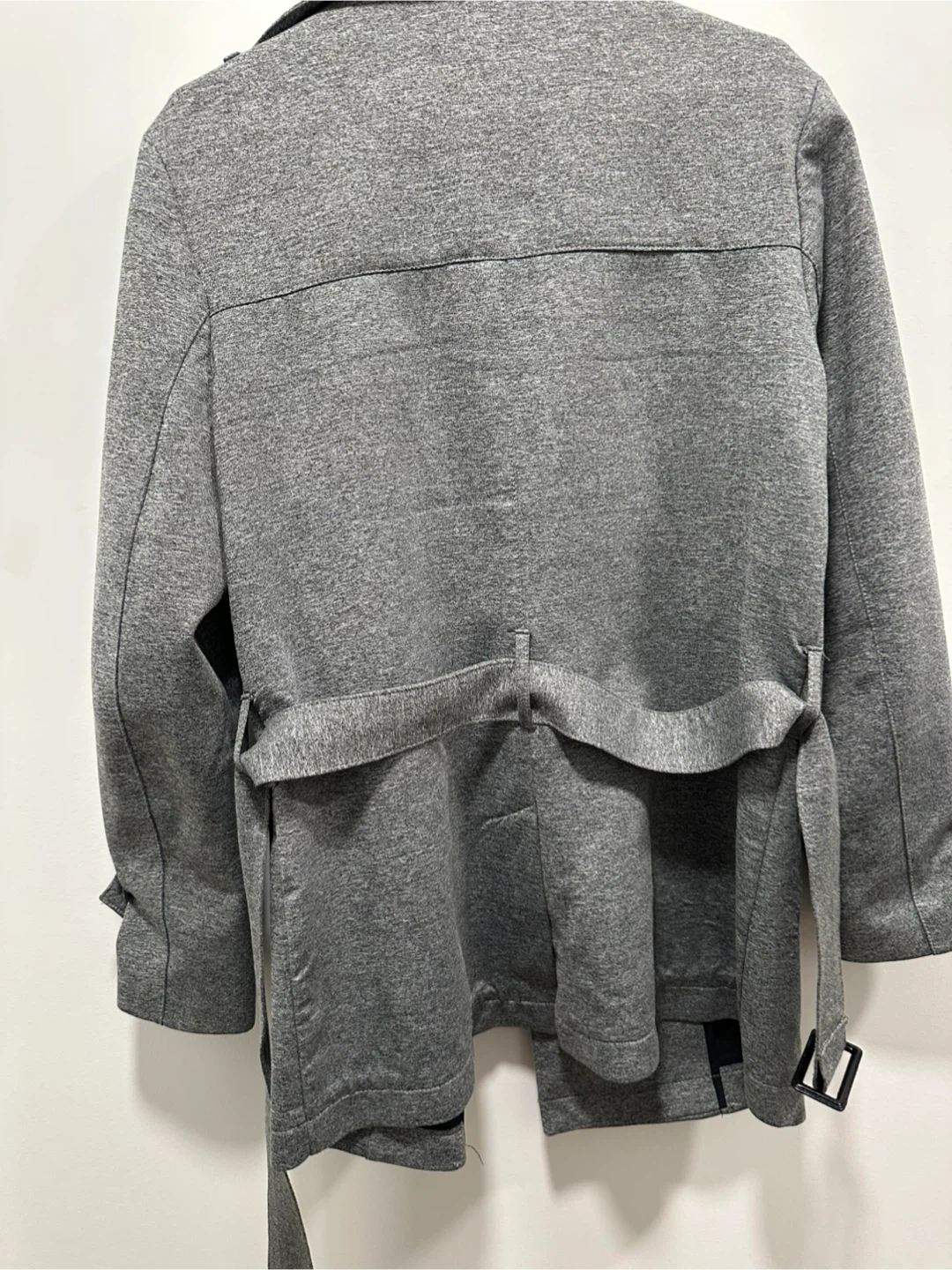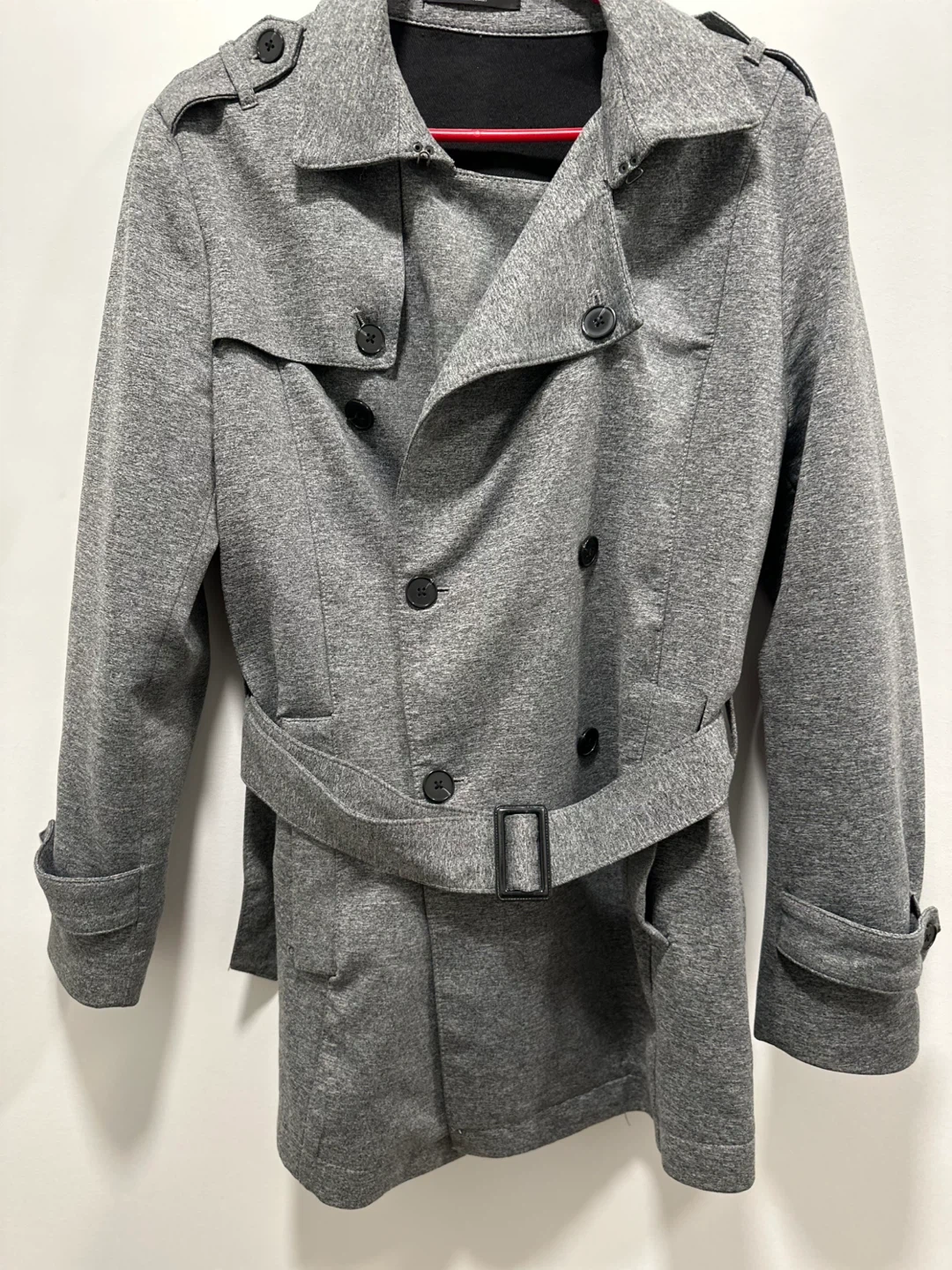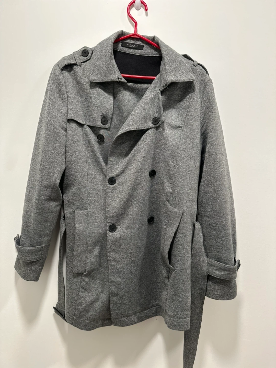 This Zara Man trench coat is grey and double-breasted. It's made of a soft, jersey-like material and comes with a matching belt. The coat features epaulets and buttoned cuffs. Size M