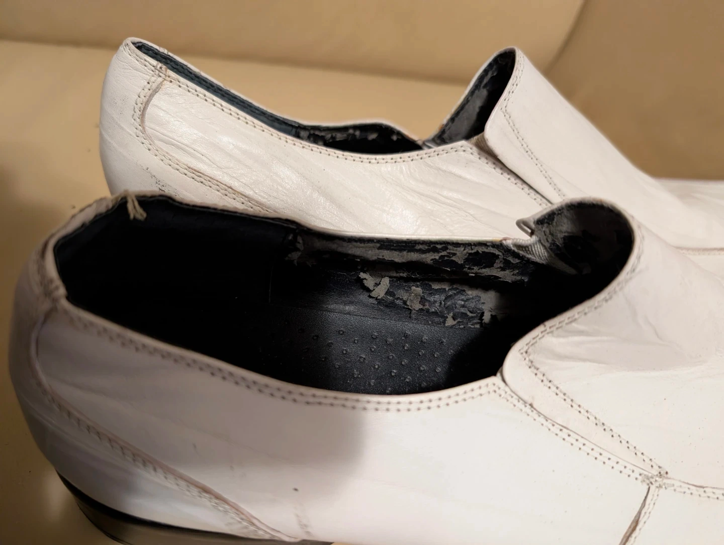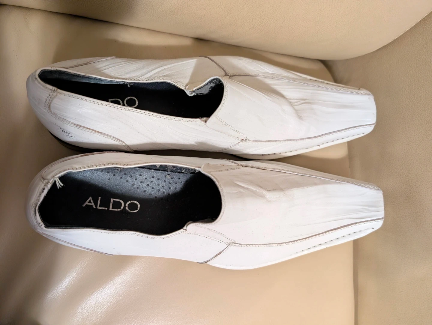These ALDO white leather loafer dress shoes have a classic slip-on design. Some wear and peeling is visible on the inner lining.
